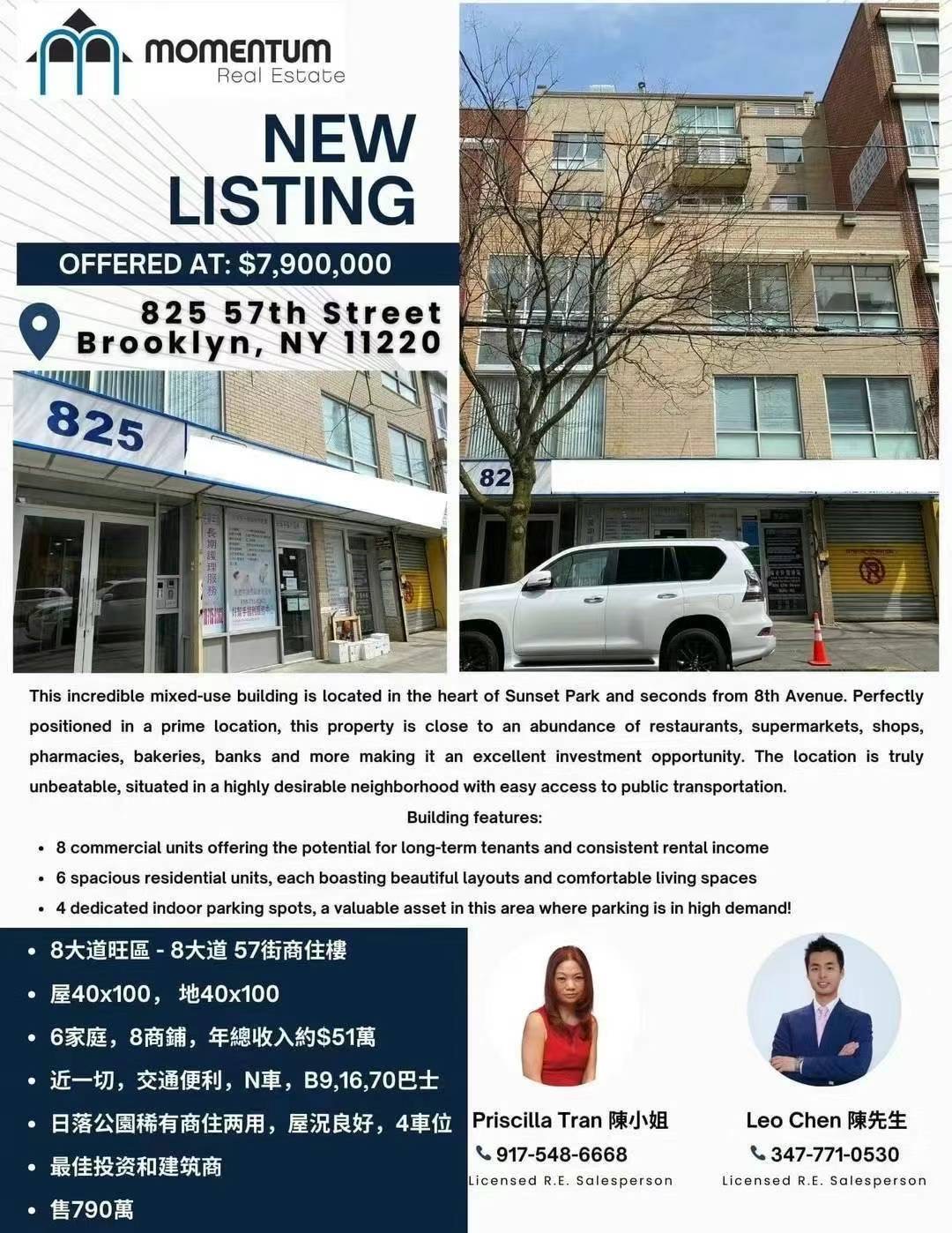 纽约布鲁克林房子出售 Brooklyn NY新上市布碌仑房屋住宅出售布鲁克林豪宅独家出售买卖🔥8大道旺區📍8大道 57街商住樓825 57街屋40x100, 地40x1006️⃣家庭8️⃣商鋪💰年總收入約$51萬🚀近一切,交通便利,N車,B9,16,70巴士🌅日落公園稀有商住两用,屋況良好,4車位🚀最佳投资和建筑商☎917-548-6668陳小姐