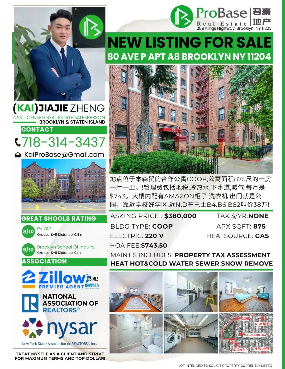 纽约布鲁克林公寓出售 Brooklyn Coop NY新上市布碌仑合作公寓大楼出售布鲁克林高大上公寓独家出售买卖[庆祝]独家代理,全新上市[庆祝][握手]欢迎转发合作3%📍80 Ave P,A8 BK NY 11204🎖875尺coop合作公寓🎖一房一厅一卫拎包入住🎖8/9分学区,出门公园,学校🎖近N,D,W车,B4,B6,B82🎖洗衣房可用手机应用连接🎖大楼配有内有Amazon柜子🏰管理费每月743