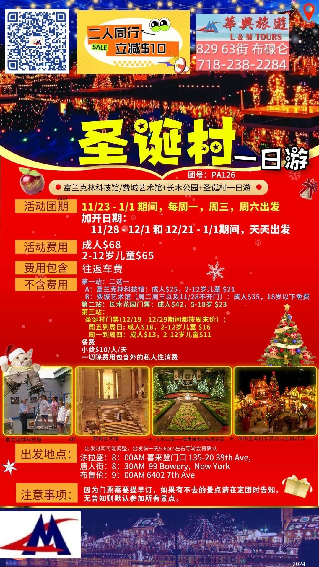二人同行华典旅遊 L&MTOURSSALE 立减$10 829 63街 布碌仑 718-238-2284圣诞村 团号:PA126 日游 富兰克林科技馆/费城艺术馆+长木公园+圣诞村一日游