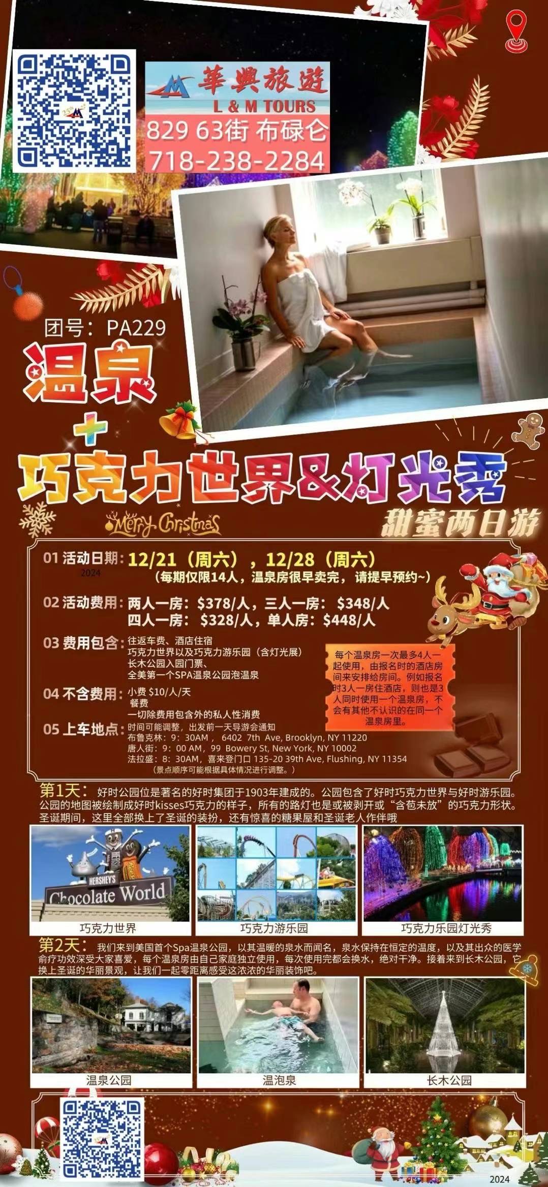 华典旅遊L&M TOURS829 63街 布碌仑718-238-2284温泉 团号:PA229 巧克力世界&灯光秀MeriyGrstmas 甜蜜两日游 01活动日期:12/21(周六),12/28(周六)