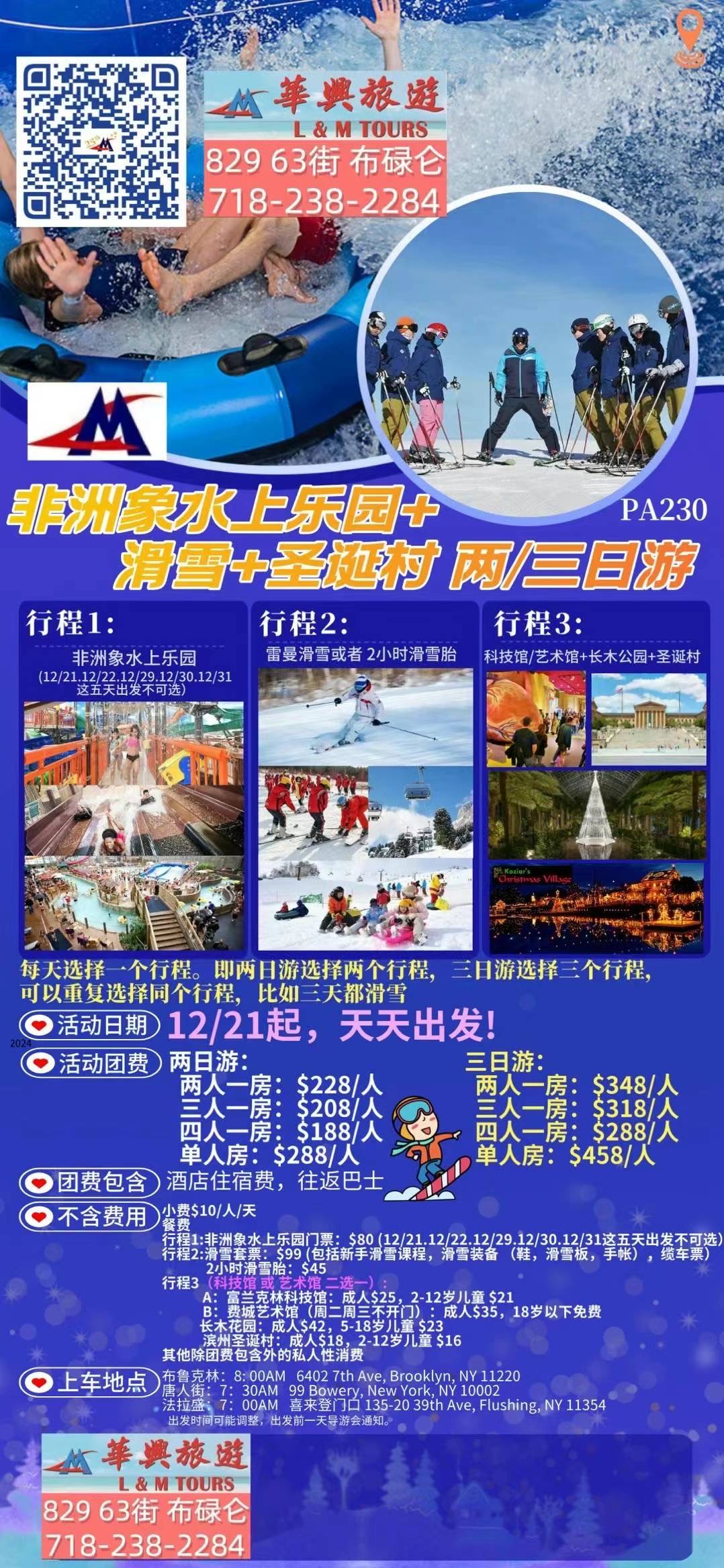 行程2:滑雪或者2小时滑雪胎 行程3:科技馆/艺术馆+长木公园+圣诞村 行程1:非洲象室内水上乐园(12/21,12/22,12/29, 12/30,12/31这五天出发不可选) 滑雪+非洲象水上乐园+圣诞村 两/三日游(PA230) 不含费用: 行程2: 小费$10/人/天,餐费 行程1:非洲象水上乐园门票:S80 法拉盛:7:00AM 唐人街:7:30AM 布鲁伦:8:00AM