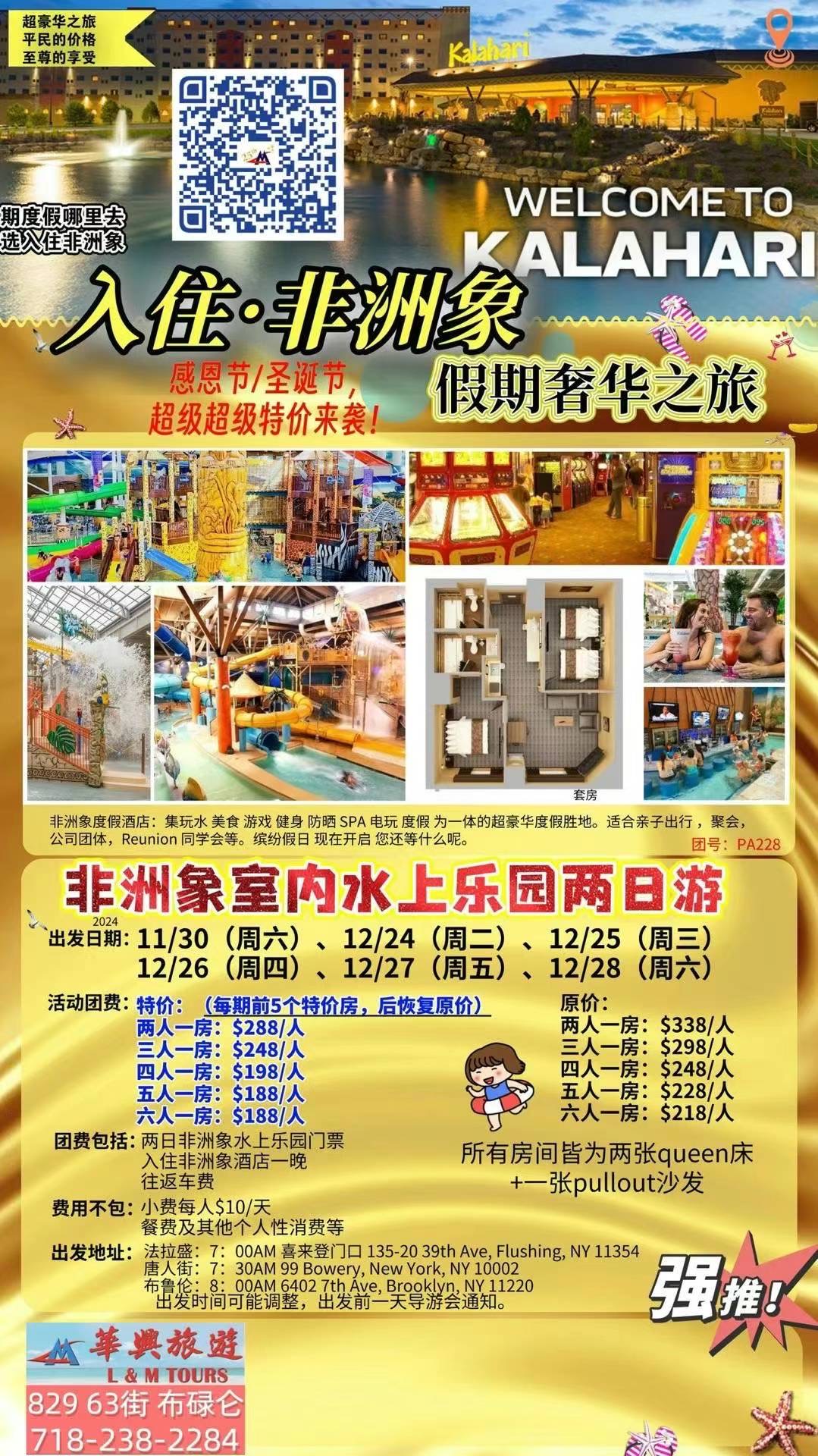 从華典旅遊L&MTOURS829 63街 布碌仑718-238-2284非洲象水上乐园+ PA230 滑雪+圣诞村 两/三日游