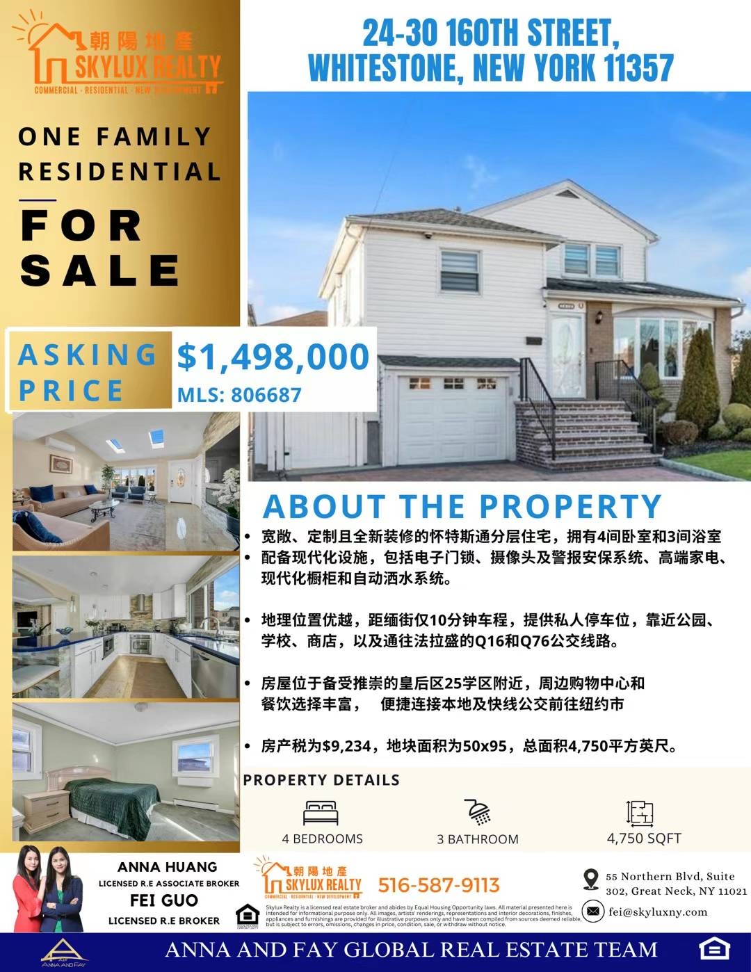 纽约白石镇房子出售Whitestone NY 新上市白石镇房屋出售白石镇豪宅独家出售买卖[太阳][太阳]🥇🥇這周日看白石鎮四层大型一家庭 ‼️149.8萬4成 兩家庭格局 高級新裝修-25学区- 地大: 4750sqft- 屋面积: 2350- 4房3卫- 完成地下室- 私人停车位- 地税: $9,234- 近公园, 学校, 商店, 油站,银行-巴士Q16,Q76直达法拉盛9分好学区 PS184, IS25 Arien, Citywide HS近Francis Lewis Blvd商业区. 交通发达, 开车10分钟直达法拉盛.一楼: 客厅, 饭厅, 厨房 1房 1浴、車庫、Deck二楼: 2房 1卫、三楼: 1房1卫分開出入完成地下室: 宽敞家庭房, 洗衣房ANNA &FAY TEAM @朝陽地產 skylux realty🔥🔥516-587-9113 歡迎🈴️作 方便看