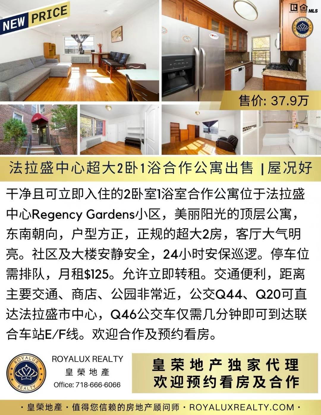 纽约法拉盛豪华公寓出售 Flushing Luxury Coop NY新上市法拉盛高级合作公寓大楼出售法拉盛高大上公寓独家出售买卖 皇荣地产独家代理好房源👑法拉盛中心超大2卧1浴合作公寓出售 | 屋况好| 新售价37. 9万👑房子介绍:干净且可立即入住的2卧室1浴室合作公寓位于法拉盛中心Regency Gardens小区,美丽阳光的顶层公寓,东南朝向,户型方正,正规的超大2房,客厅大气明亮。社区及大楼安静安全,24小时安保巡逻。停车位需排队,月租$125。允许立即转租。交通便利,距离主要交通、商店、公园非常近,公交Q44、Q20可直达法拉盛市中心,Q46公交车仅需几分钟即可到达联合车站E/F线。欢迎合作及预约看房。📲请联系负责经纪约看Sara Chen:347-913-6868