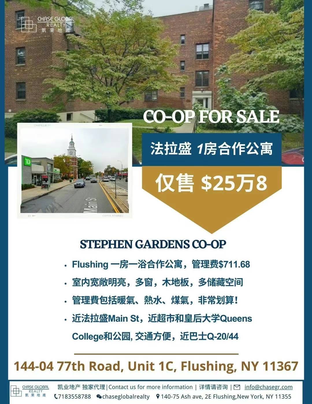 独家代理近皇后大学1房coop 合作公寓出售$25万8