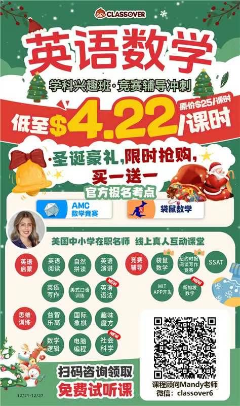 我孩子上的Classover这个在线学校,效果挺好的,周围很多朋友的孩子也在这里学习。老师都是美国中小学的老师,孩子们也很喜欢。30多个科目,数学英语、逻辑思维,竞赛都有。目前他们有圣诞促销,可以先试听,用我的推荐码:59B3AB