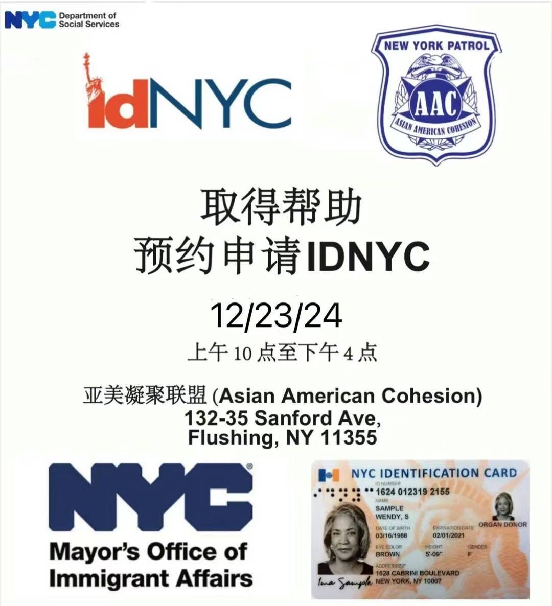 好消息!亚裔凝聚联盟 (AAC) 和纽约市长移民事物办公室(MOIA)合作,将在法拉盛帮助移民预约申请纽约市民卡,时间:12月23日,周一,上午10点至下午4点,地点:132-35 Sanford Ave (AAC 办公室,一楼), Flushing, NY 11355. 纽约市民卡的福利包括:在 NYC Housing Connect 上申请廉租房,35个博物馆,动物园,免会员费一年,YMCA 会员费15%折扣,申请健康保险等等。申请时所需的材料:1. 美国或中国护照,驾照,绿卡,联邦移民局释放纸(I-797), 2. 60 天之内的:银行月结单,或水,或电,或煤气,或信用卡,或因特网账单,或房租合同。预约后,申请人须前往就近的纽约市民卡中心提交文件和照相(旧卡更新则无需前往), 欢迎新老移民前来办理😎😎