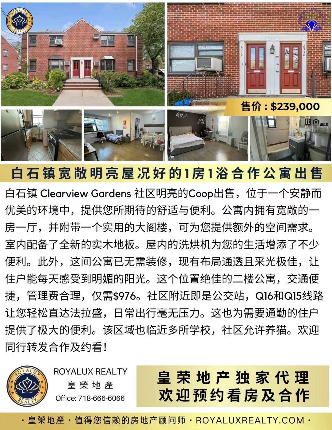👑房子介绍:白石镇 Clearview Gardens 社区明亮的Coop出售,位于一个安静而优美的环境中,提供您所期待的舒适与便利。公寓内拥有宽敞的一房一厅,并附带一个实用的大阁楼,可为您提供额外的空间需求。室内配备了全新的实木地板。屋内的洗烘机为您的生活增添了不少便利。此外,这间公寓已无需装修,现有布局通透且采光极佳,让住户能每天感受到明媚的阳光。这个位置绝佳的二楼公寓,交通便捷,管理费合理,仅需$976。社区附近即是公交站,Q16和Q15线路让您轻松直达法拉盛,日常出行毫无压力。这也为需要通勤的住户提供了极大的便利。该区域也临近多所学校,社区允许养猫。欢迎买家咨询646 239 4836