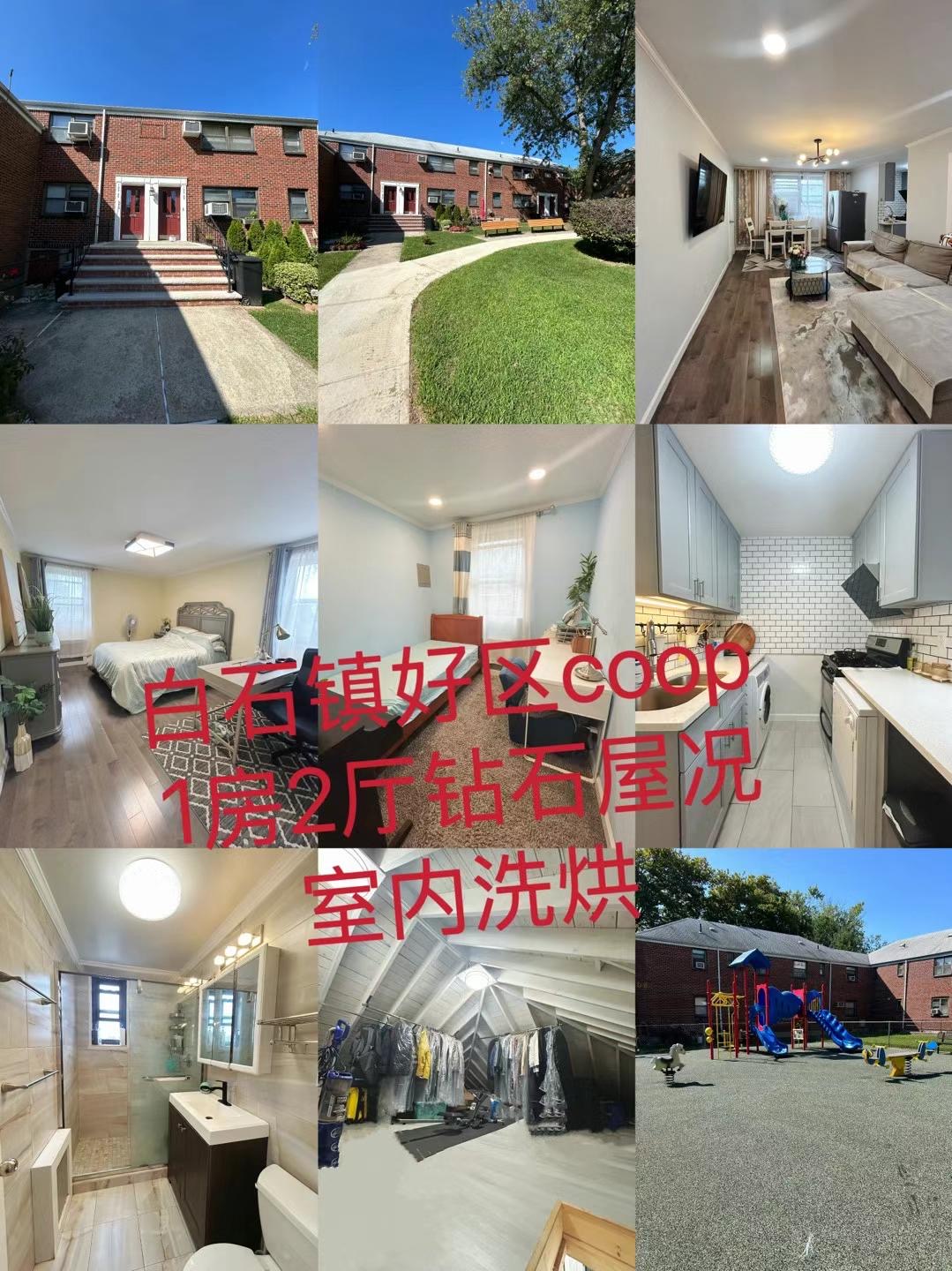 皇后区白石镇花园式合作公寓, 二楼1房2厅1卫(已改成两房一厅),加大阁楼;新装修,钻石屋况,大客厅,饭厅,新装修厨房和厕所,宽敞卧室,实木地板,壁橱多, 三面有窗,通风明亮,管理费全包,有室内洗衣机,有室外儿童游乐场,有车位车库出租;交通便利,近高速,近快速巴士去曼哈顿;生活方便,可步行去超市,餐厅,邮局,学校,图书馆,公园等。管理费 : $976.72 (水电煤暖全包),转手费: $4,000 (卖家付)。屋主自住,不可出租, 可以养猫。📲请联系负责经纪约看:Jean 646-546-6309