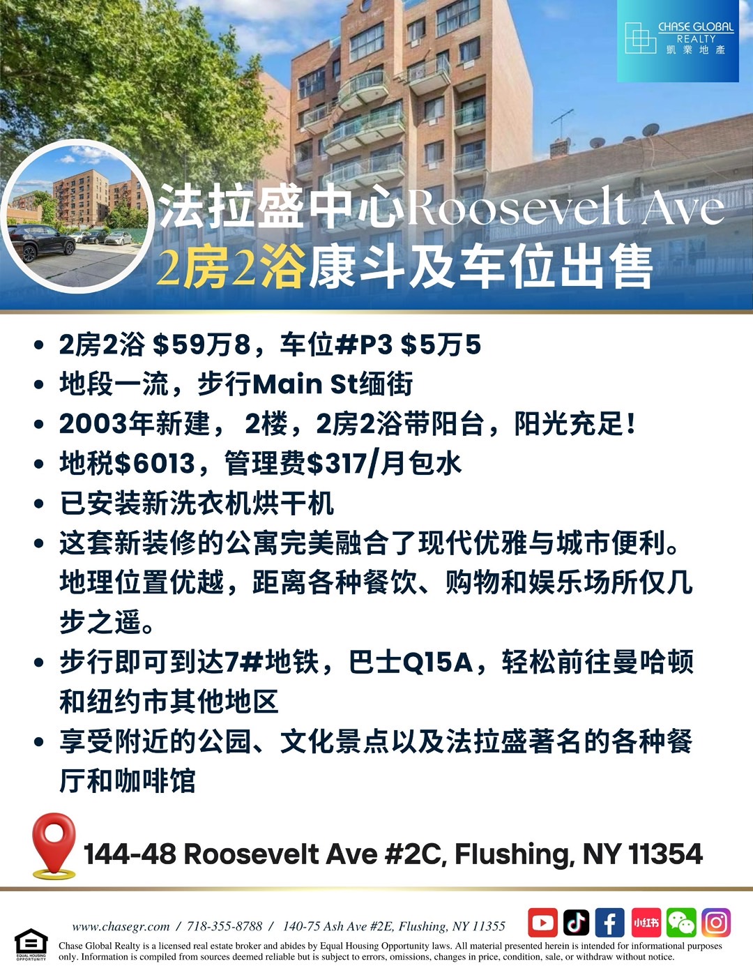 纽约法拉盛房屋出售 Flushing NY新上市法拉盛房子出售法拉盛豪华住宅独家出售买卖 凯业独家代理 法拉盛中心Roosevelt Ave2房2浴康斗及车位出售