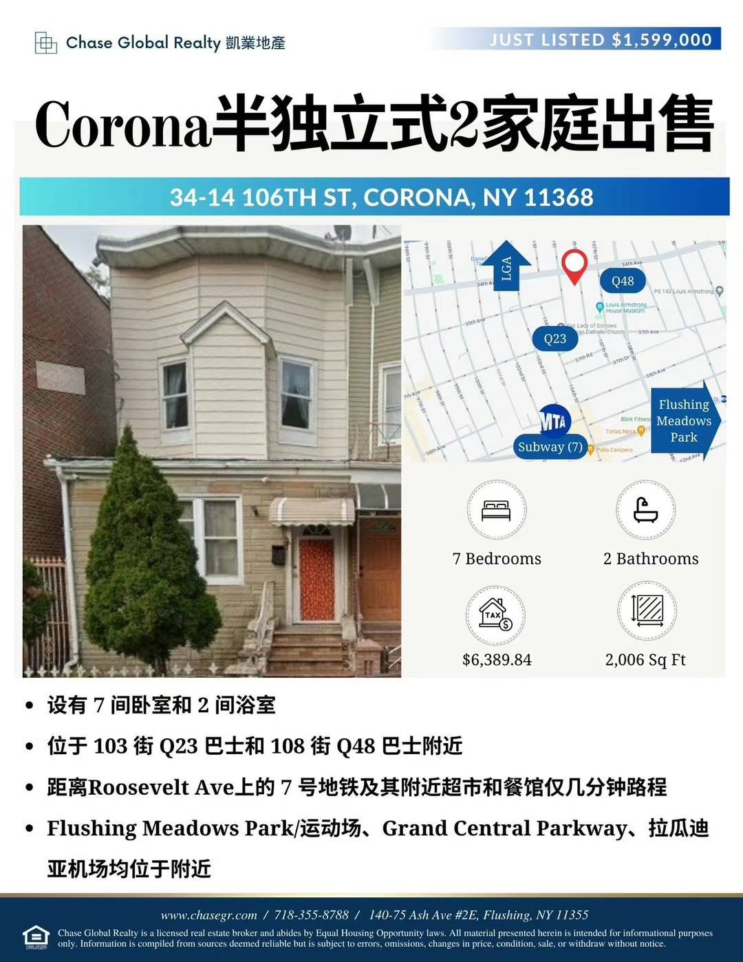 纽约可乐娜房子出售Corona NY 新上市可乐娜房屋住宅出售可乐娜豪宅独家出售买卖🔥凯业地产最新房源 Corona半独立式2家庭售159万9