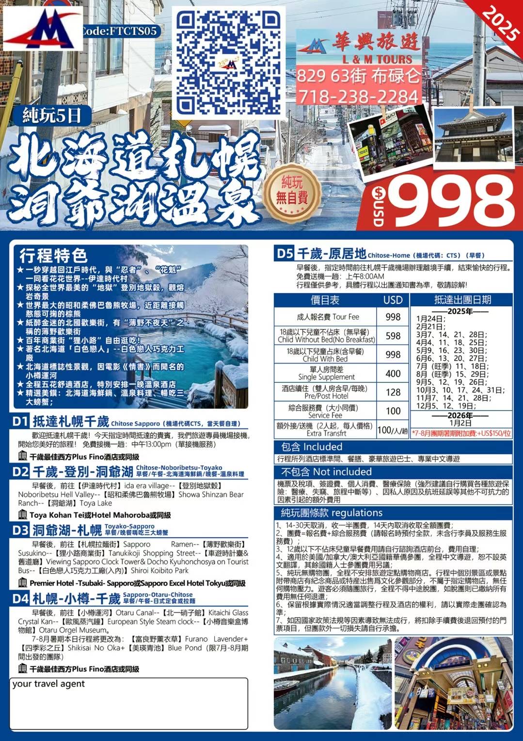 ⓵日本北海道札幌洞爷湖温泉纯玩𝟝天