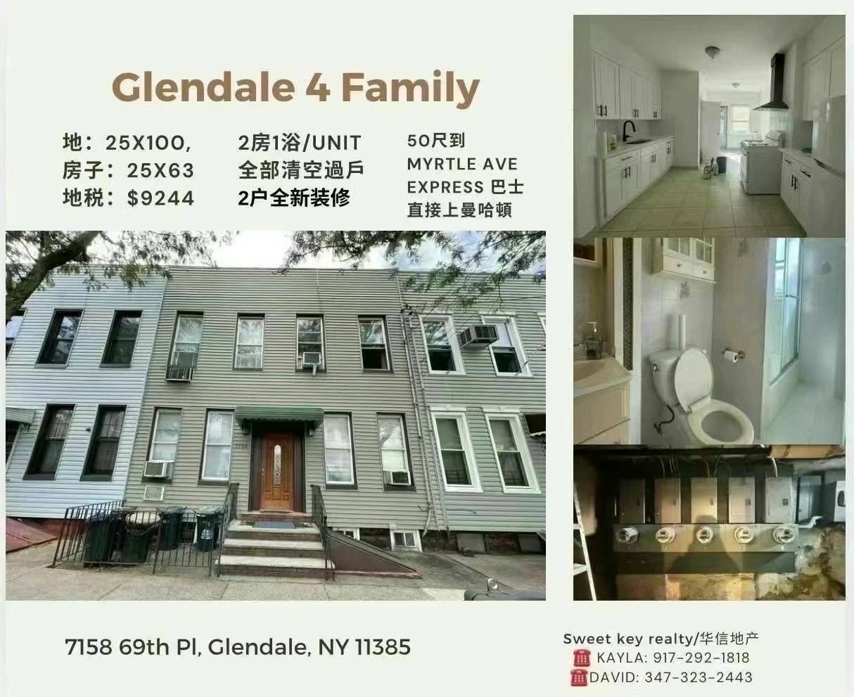 💰售:$155萬(收租約在15-16萬)7158 69th Pl, Glendale, NY 11385全部清空過戶!地:25X100, 房子:25X63,地税:$9244, 2房1浴/Unit