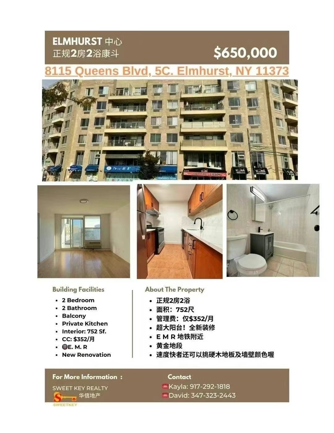 🎈纽约艾姆赫斯特豪华康斗出售Elmhurst Condo NY新上市艾姆赫斯特高级康斗出售艾姆赫斯特豪华康斗独家出售买卖🎈华信独家代理,欢迎合作8115 Queens Blvd Elmhurst中心地段正规2卧2浴💰售:$65.5 万752尺,超大阳台!全新装修!管理费:仅$352/月黄金地段!全新装修!速度快者还可以挑硬木地板及墙壁颜色喔!☎️ 917-292-1818(有钥匙🔑,方便看)