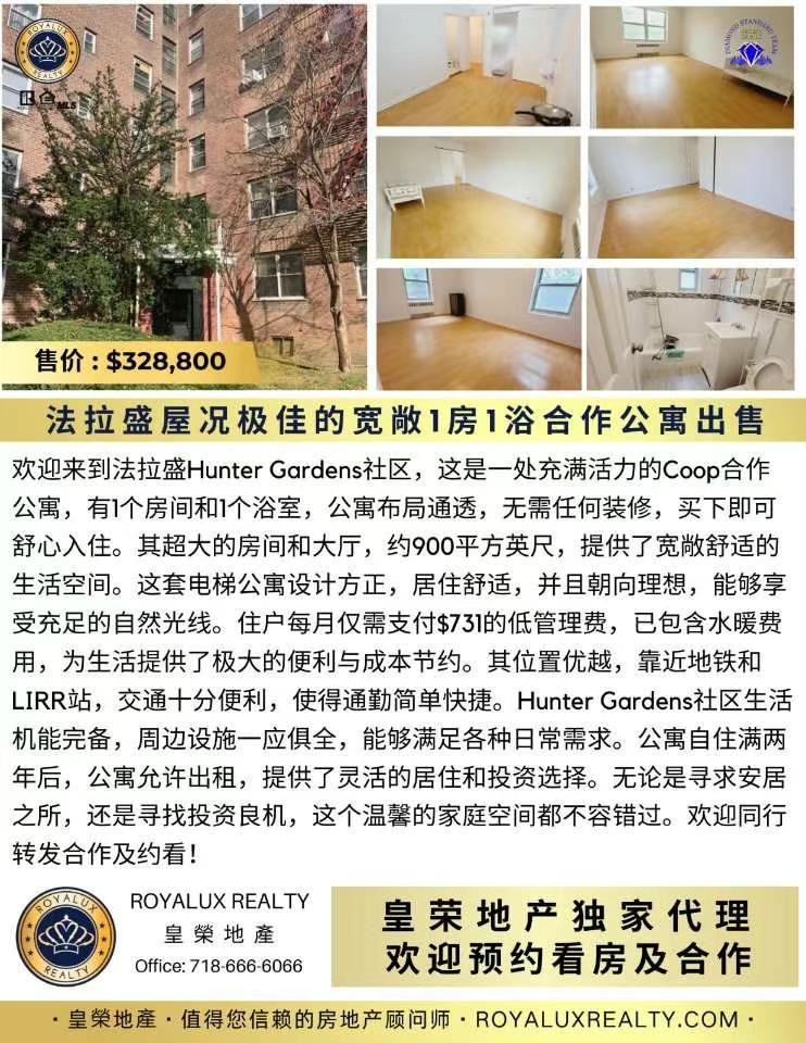 👑房子介绍:欢迎来到法拉盛Hunter Gardens社区,这是一处充满活力的Coop合作公寓,有1个房间和1个浴室,公寓布局通透,无需任何装修,买下即可舒心入住。其超大的房间和大厅,约900平方英尺,提供了宽敞舒适的生活空间。这套电梯公寓设计方正,居住舒适,并且朝向理想,能够享受充足的自然光线。住户每月仅需支付$731的低管理费,已包含水暖费用,为生活提供了极大的便利与成本节约。其位置优越,靠近地铁和LIRR站,交通十分便利,使得通勤简单快捷。Hunter Gardens社区生活机能完备,周边设施一应俱全,能够满足各种日常需求。公寓自住满两年后,公寓允许出租,提供了灵活的居住和投资选择。无论是寻求安居之所,还是寻找投资良机,这个温馨的家庭空间都不容错过。646 239 4836