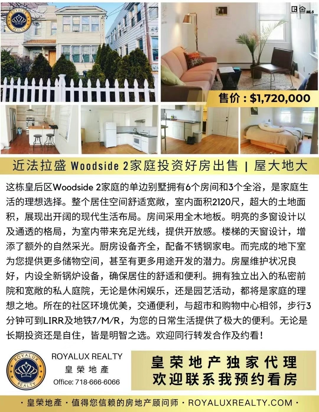 纽约皇后区木边房子出售Woodside Queens NY新上市木边房屋独家出售买卖🎊近法拉盛 Woodside 2家庭🎊投资好房出售|屋大地大售价:172万‼️