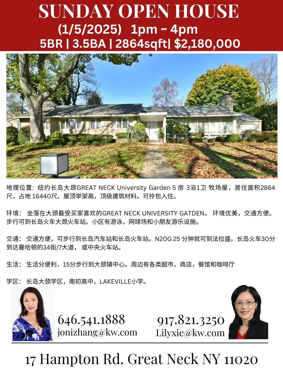 🎈地理位置:纽约长岛大颈GREAT NECK University Garden 5 房 3浴1卫 牧场屋,居住面积2864尺,占地 16440尺。屋顶举架高,顶级建筑材料。可拎包入住。
