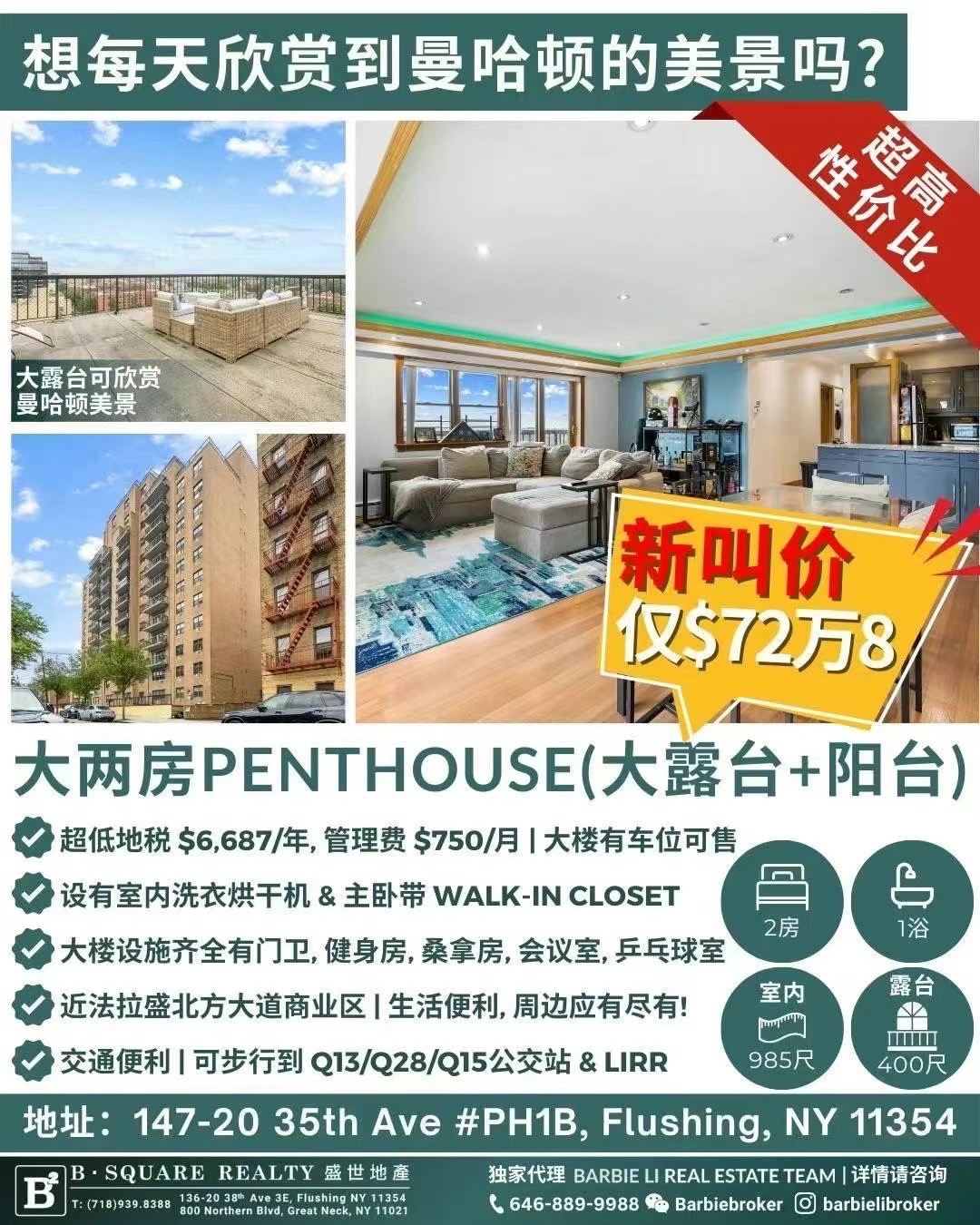 📢超高性价比💥法拉盛大型两房Penthouse康斗!!