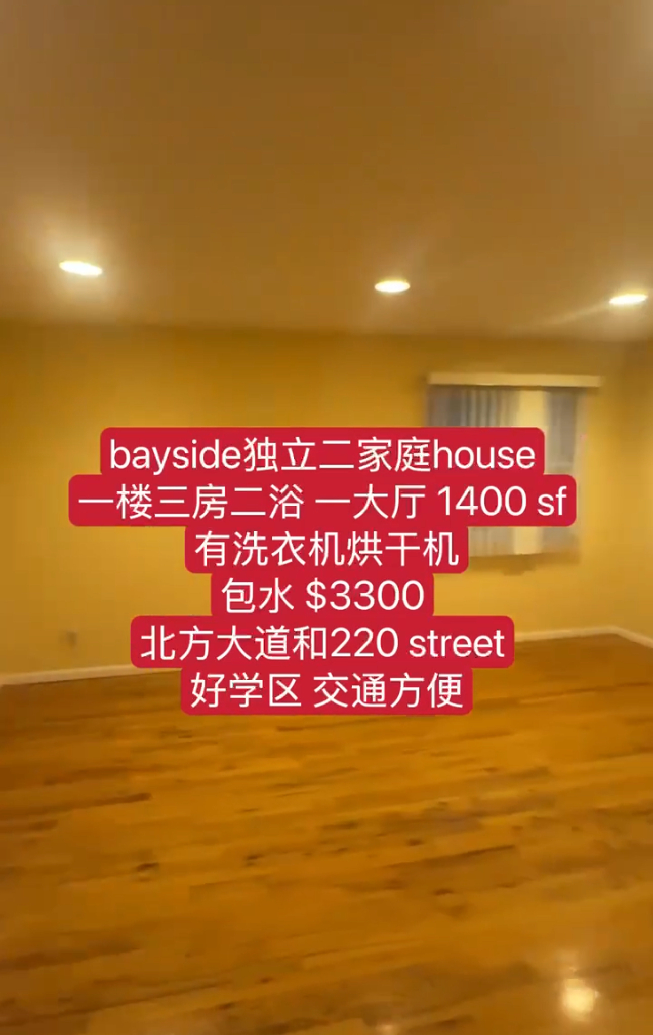 纽约贝赛租房 Bayside NY新上市贝赛房子住宅出租Bayside好出租,近北方大道和220 街,好学区 三房二浴室 大大厅 1400 尺,二家庭house的一楼。周边非常容易停车 ☎️718-316-3966