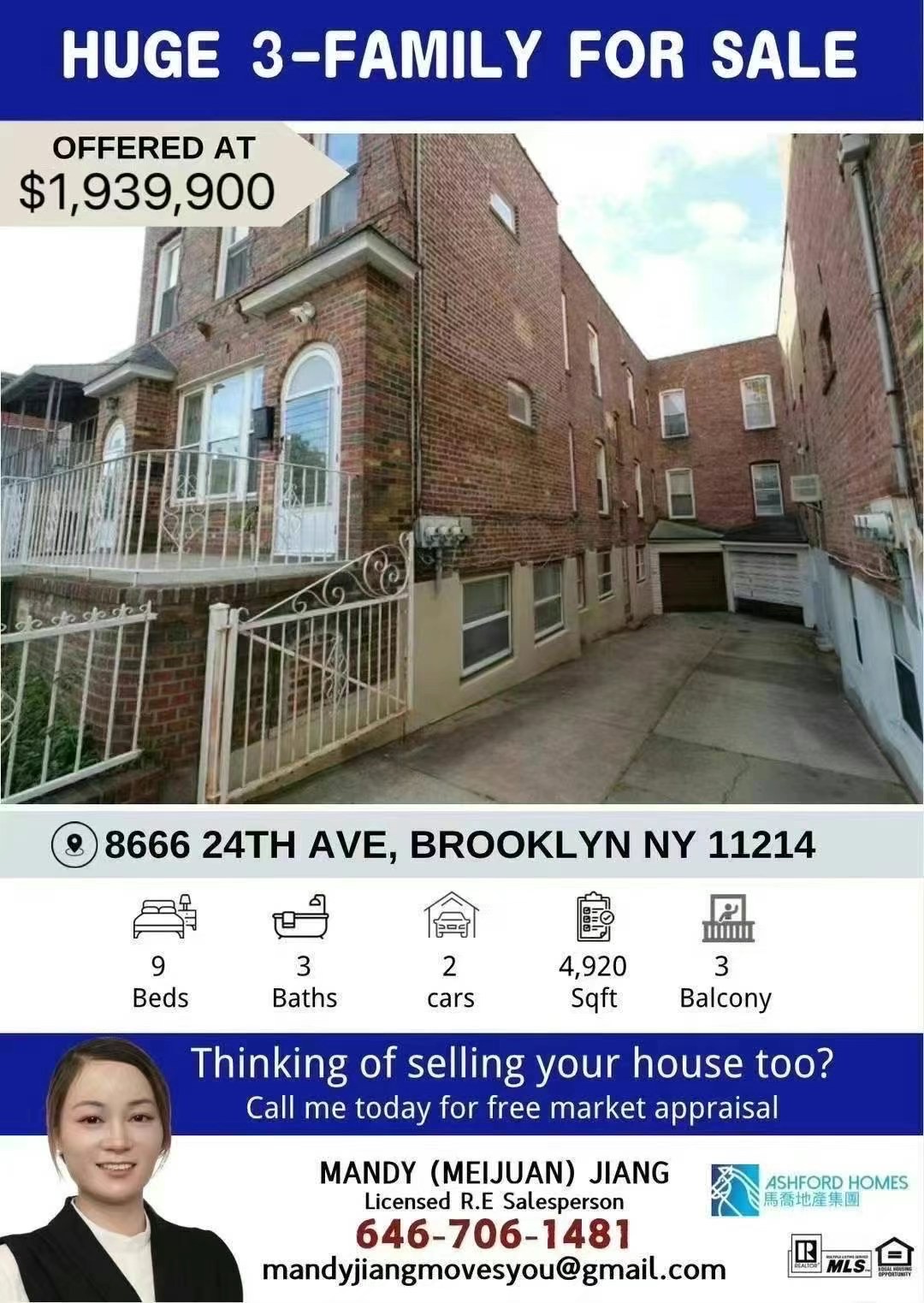 纽约布鲁克林房子出售 Brooklyn NY新上市布碌仑房屋住宅出售布鲁克林豪宅独家出售买卖🏠 特大合法三家庭单边砖房👏欢迎同行合作转发📍 8666 24th Ave Brooklyn, 24大道86街✅地:30x97✅屋:前面22x50+後面30x18*每层1,640平方英尺(不計算後面陽台面積)总实用面积4,920平方英尺🎉walk in: 2房一廳🎉一樓:三房一廳+額外前後陽台🎉二樓:四房一廳+額外後面陽台🅿️ 私家車庫:可停2輛車✅ 1分钟到10分小学 Ps 101✅ 半条街到86街,近超市,银行,D车地铁地稅:$12,005✅ 清空过户,方便约看 💰售$1,939,900万☎️646-706-1481 蒋小姐