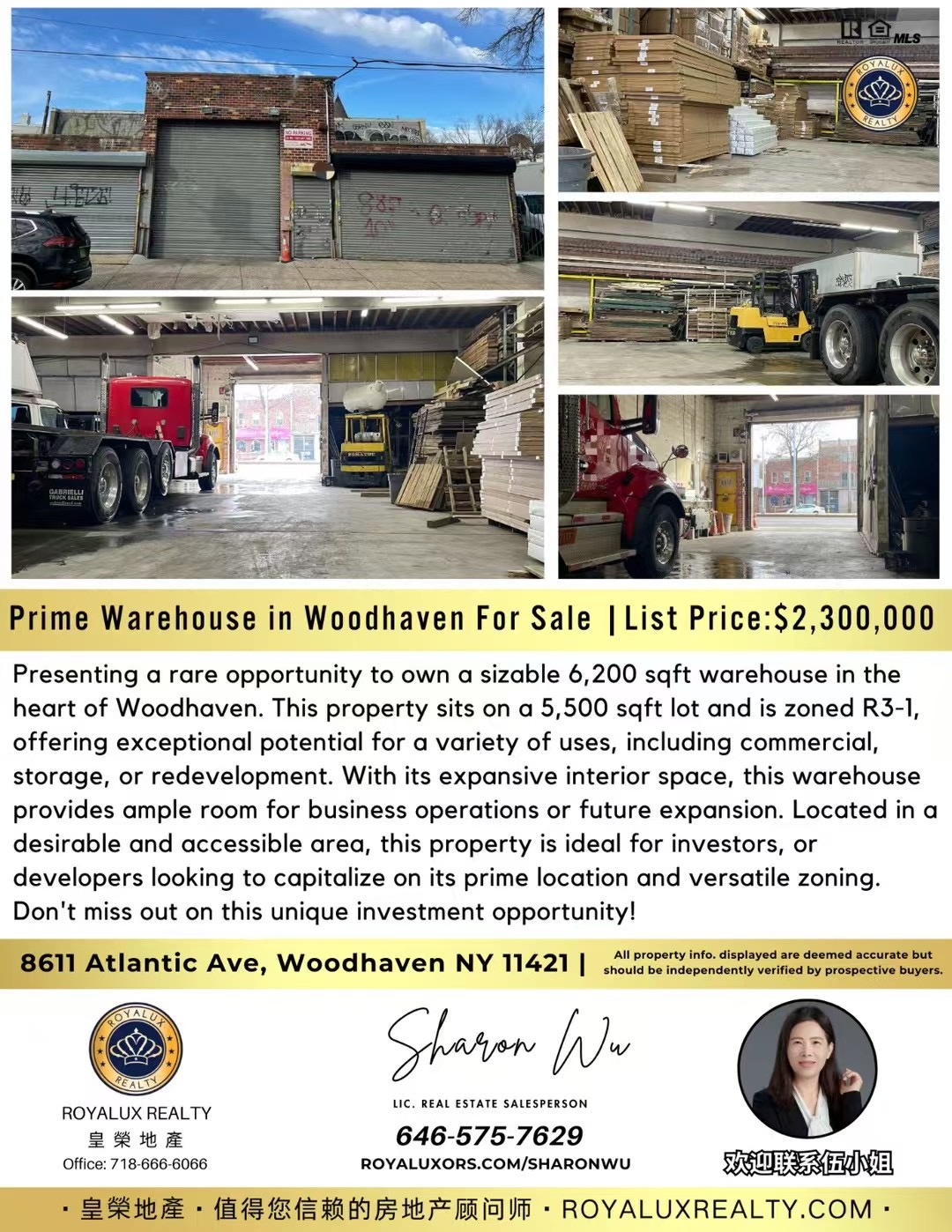 👑仓库介绍:这是一个难得的机会,拥有位于Woodhaven核心地带的6200平方英尺大仓库。该物业占地5500平方英尺,属于R3-1区域,具有出色的潜力,可用于多种用途,包括商业、存储或重新开发。凭借宽敞的内部空间,这个仓库为商业运营或未来扩展提供了充足的空间。该物业位于一个理想且交通便利的区域,非常适合投资者或开发商,尤其是那些希望利用其优越位置和多功能分区的机会。不要错过这个独特的投资机会!欢迎同行转发合作及约看!📲联系负责经纪约看:Sharon 646-575-7629
