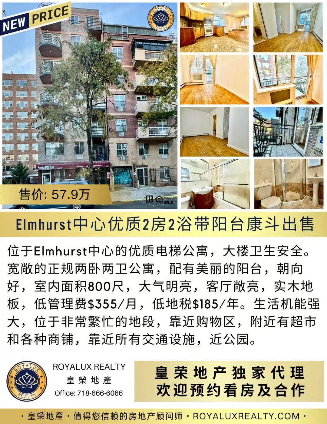 纽约艾姆赫斯特豪华康斗出售Elmhurst Condo NY新上市艾姆赫斯特高级康斗出售艾姆赫斯特豪华康斗独家出售买卖【价格调整】皇荣地产独家代理好房源👑Elmhurst中心优质2房2浴带阳台康斗出售| 售价57.9万👑康斗介绍:位于Elmhurst中心的优质电梯公寓,大楼卫生安全。宽敞的正规两卧两卫公寓,配有美丽的阳台,朝向好,室内面积800尺,大气明亮,客厅敞亮,实木地板,低管理费$355/月,低地税$185/年。生活机能强大,位于非常繁忙的地段,靠近购物区,附近有超市和各种商铺,靠近所有交通设施,近公园。📲约看联系负责经纪:Sara Chen:347-913-6868