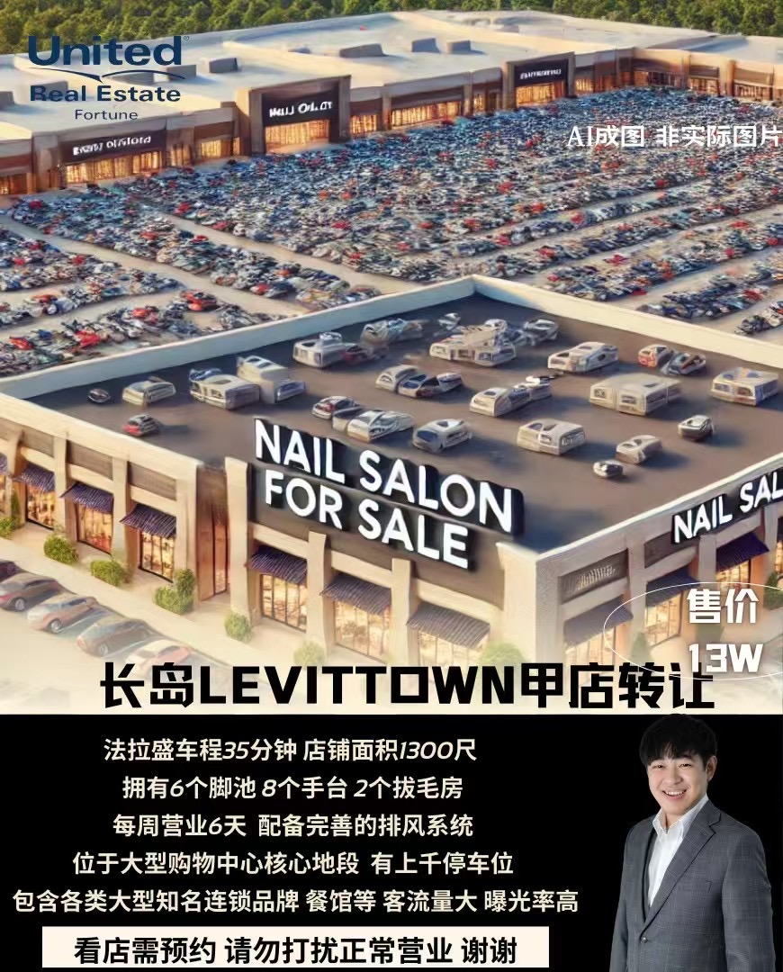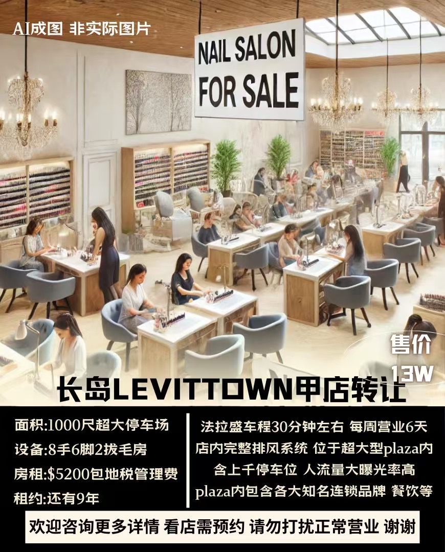 🎉纽约指甲店出售 新上市🎉全新上市 法拉盛车程30分钟甲店面积1300尺 6脚8手2房房租5200包地税管理费 位于大型shopping center内 上千车位各类知名连锁品牌 餐馆等