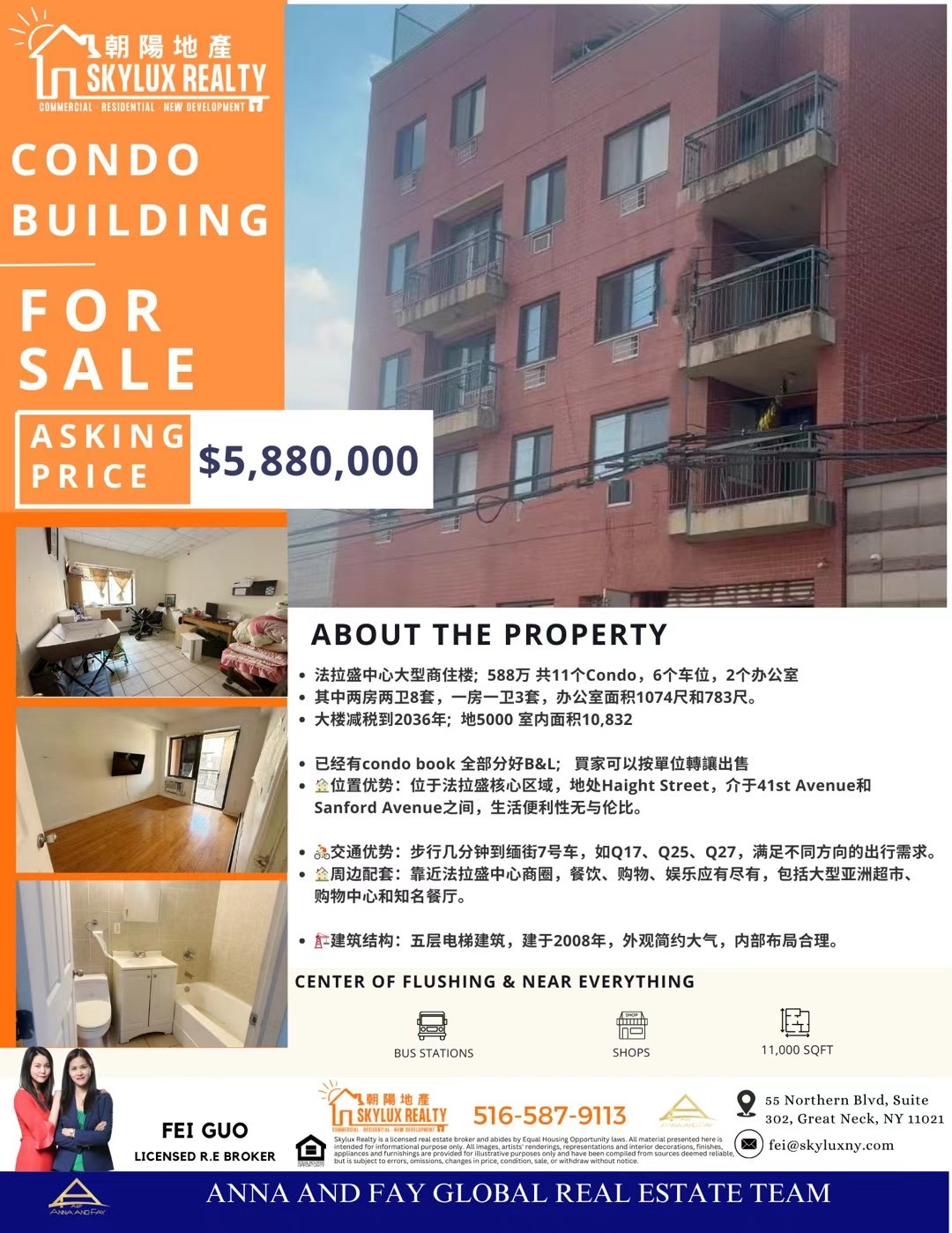 纽约法拉盛豪华公寓出售 Flushing Luxury Coop NY新上市法拉盛高级合作公寓大楼出售法拉盛高大上公寓独家出售买卖[太阳][太阳]🥇🥇周一看🆕新上市 法拉盛中心大型商住公寓大楼 Condo building 588万 共11个Condo,6个车位,2个办公室