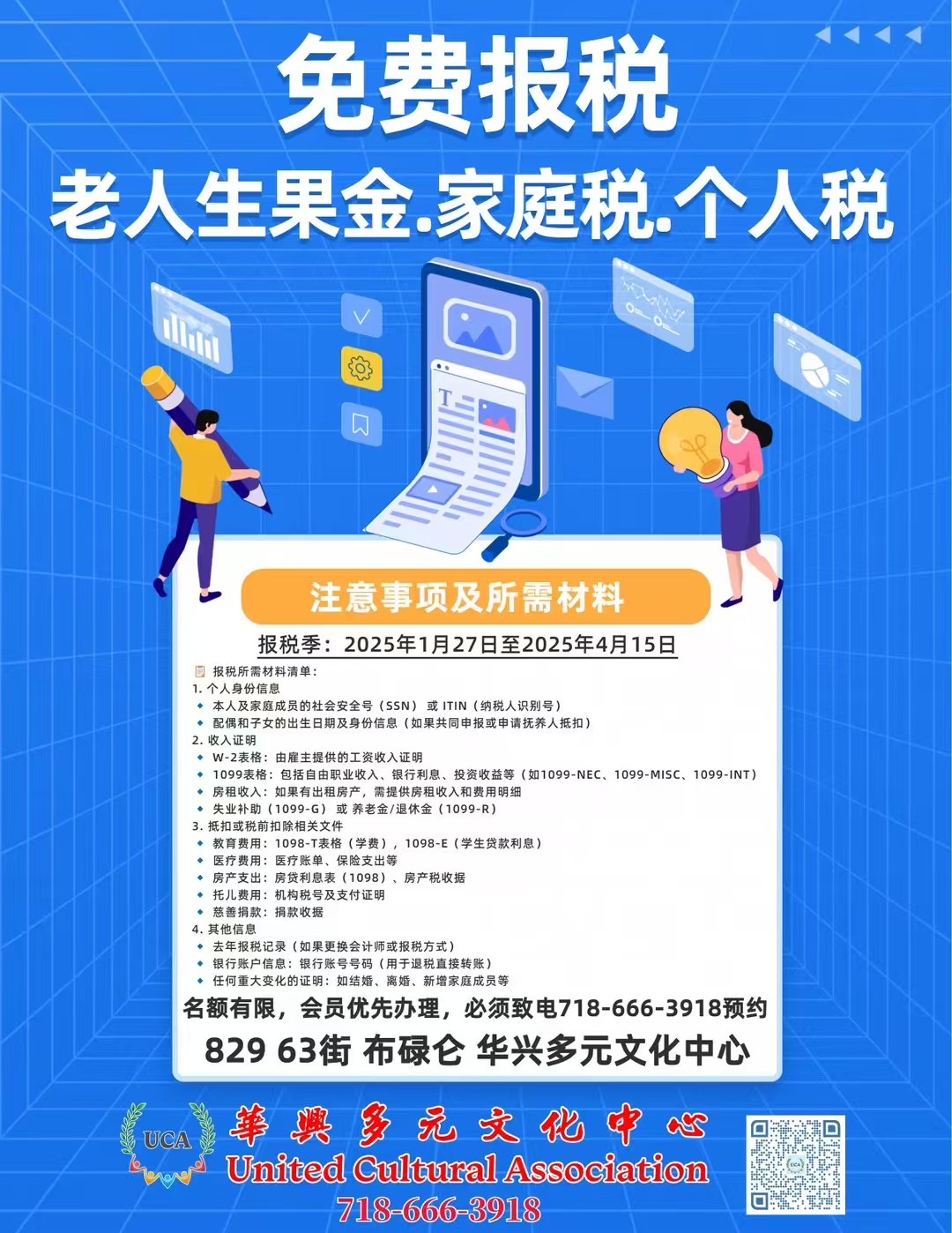纽约免费报税老人生果金. 家庭税. 个人税华兴多元文化中心829 63 Street Brooklyn 718-666-3918