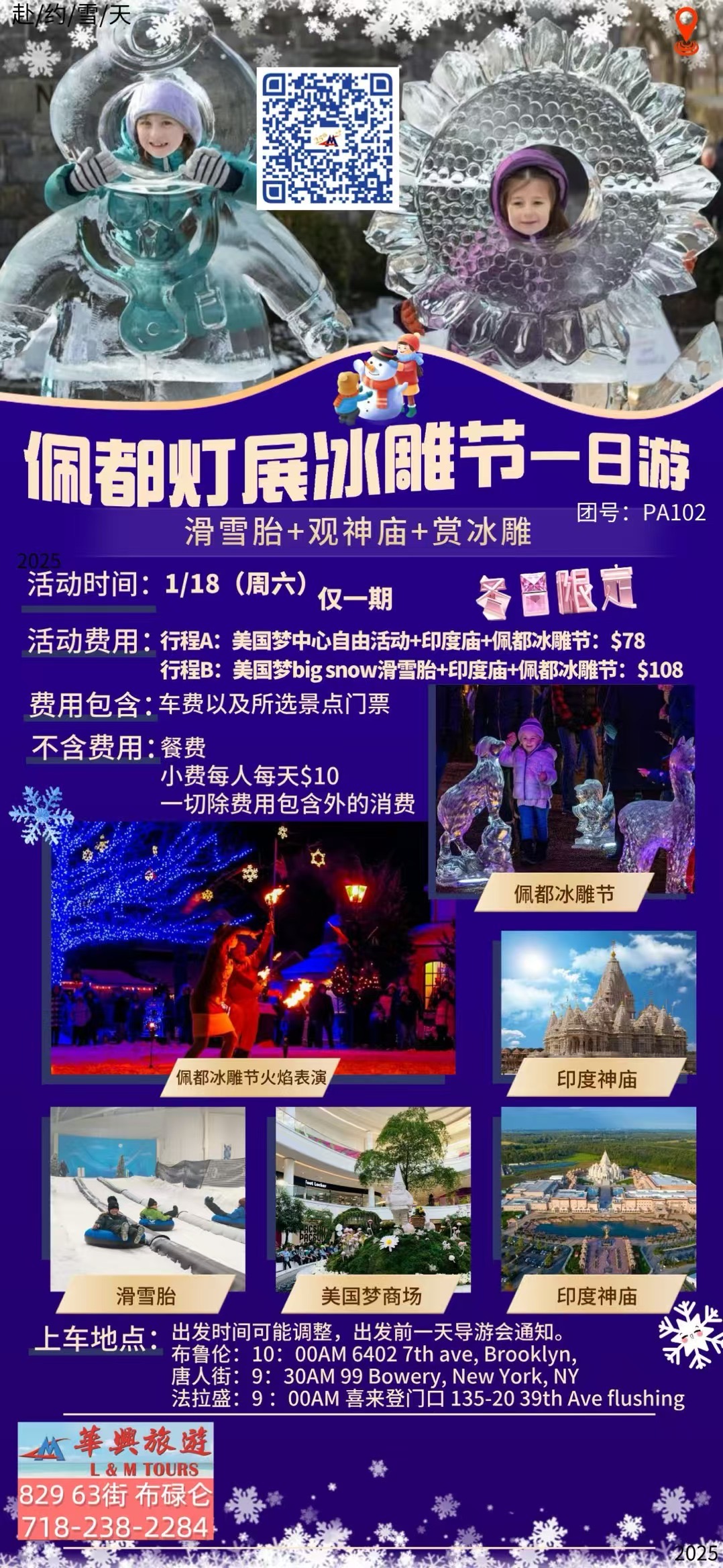 旅游滑雪胎+观神庙+赏冰雕佩都灯展冰雕节-日游团号:PA102活动时间:1/18(周六) 仅一期 限定 活动费用:行程A:美国梦中心自由活动+印度庙+佩都冰雕节:$78