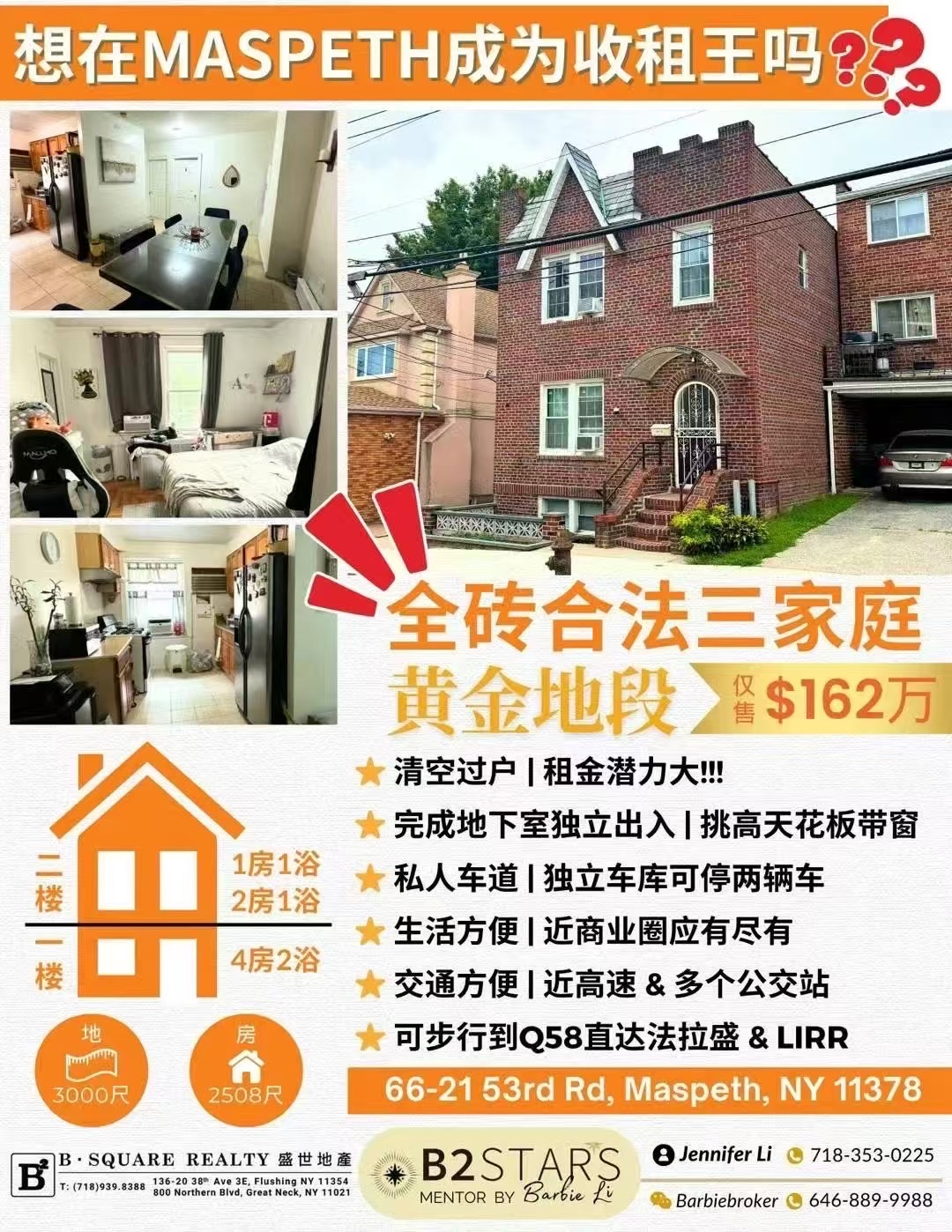 纽约皇后区麦斯佩斯房屋出售Maspeth NY新上市麦斯佩斯房子独家出售买卖🆕 黄金地段收租王! Maspeth全砖合法三家庭