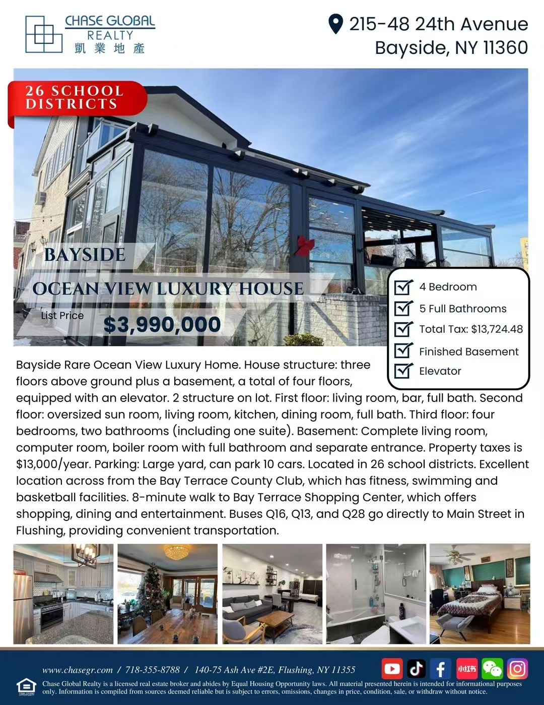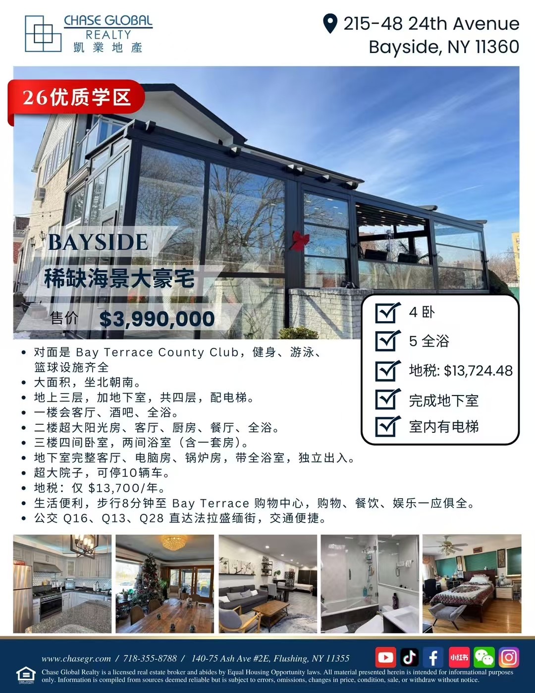 纽约贝赛房子出售Bayside NY新上市 贝赛房屋出售贝赛豪华住宅出售独家代理买卖 凯业新上市:贝赛 (Bayside) 稀缺 海景大豪宅