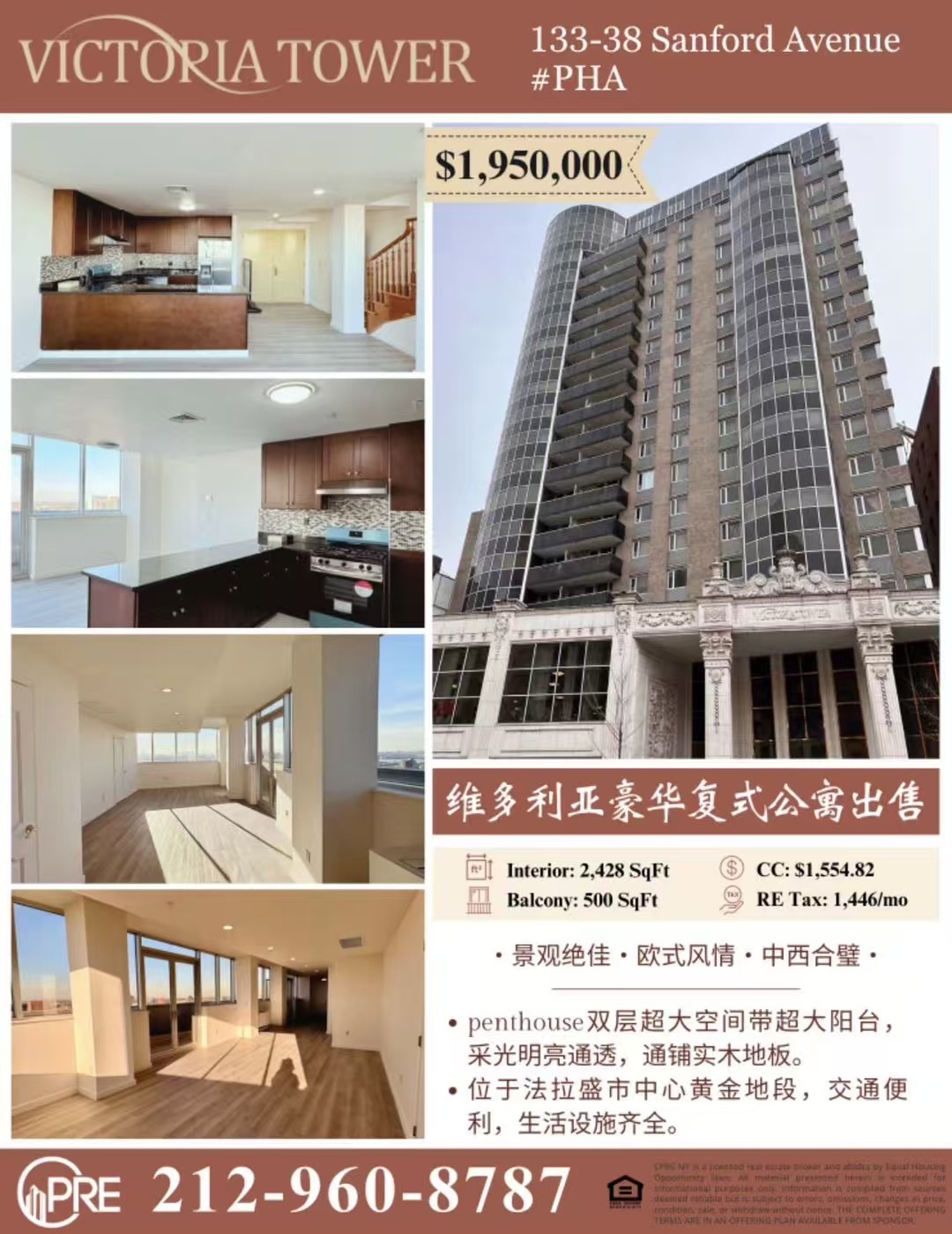 3:00PM--5:00PM法拉盛中心黄金地段维多利亚大厦豪华康斗最Penthouse楼中楼133-38 Sanford Ave Flushing2,428 平方呎 2臥3.5浴 (可改4臥)