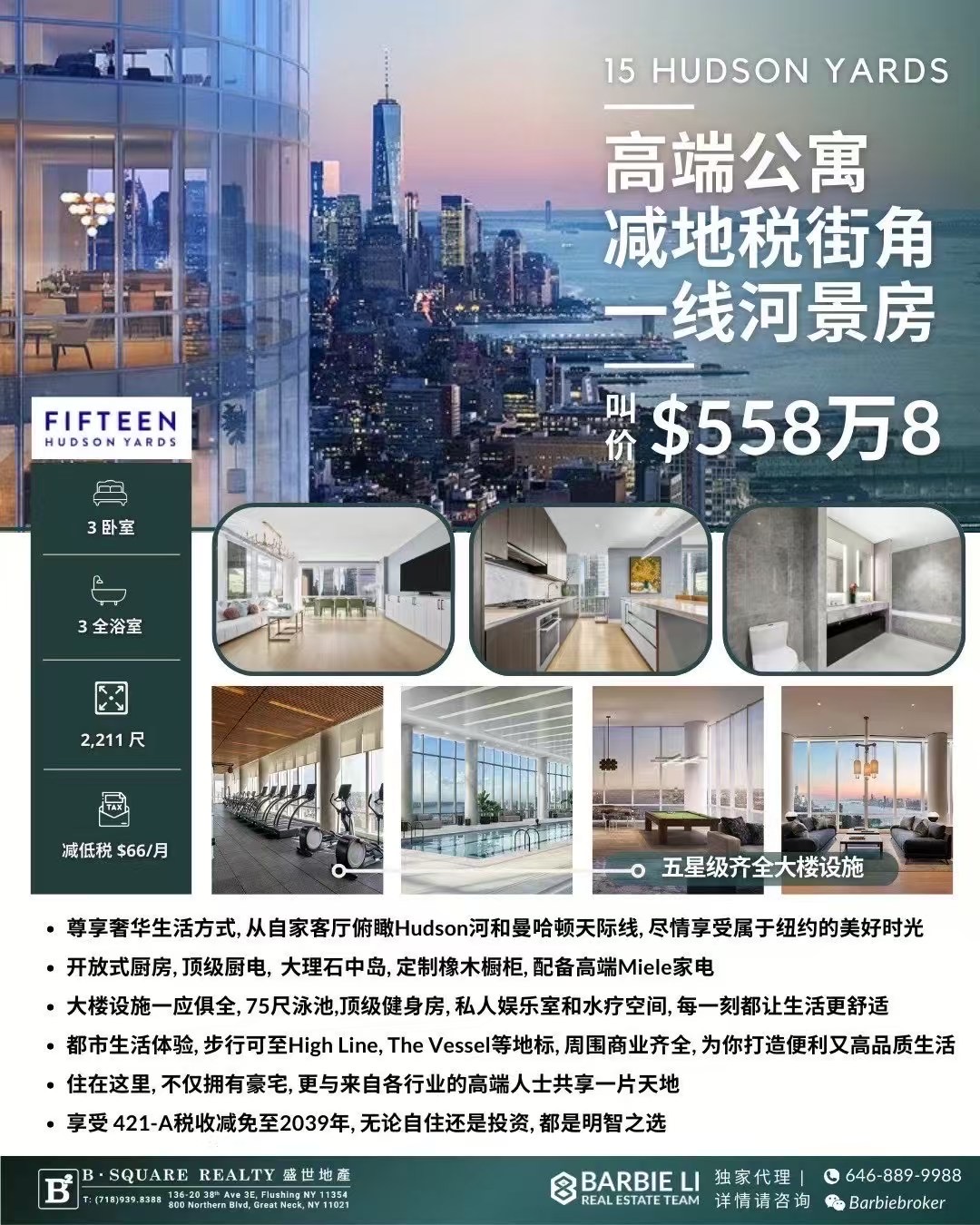 纽约曼哈顿豪华康斗出售 Manhattan Condo NY新上市曼哈顿高级康斗出售曼哈顿豪华康斗独家出售买卖💎 Fifteen Hudson Yards 高端Condo街角一线河景房 💎3房3浴 | 室内2,211尺 | 享受减地税$66.4/月