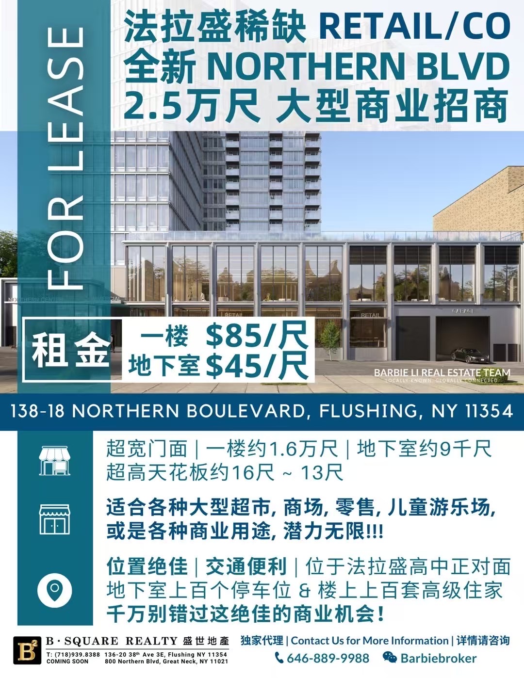 法拉盛稀缺Northern Blvd全新大型商业招商千万别错过这绝佳的商业机会!一楼约1.6万尺 $85/尺 | 地下室约9千尺 $45/尺超宽门面 | 超高天花板约16尺 ~ 13尺适合各种大型超市, 商场, 零售,儿童游乐场, 或是各种商业用途, 潜力无限!!!位置绝佳 | 交通便利 | 位于法拉盛高中正对面地下室上百个停车位 & 楼上上百套高级住家!⭐盛世地产 独家代理经纪Barbie Li Team⭐