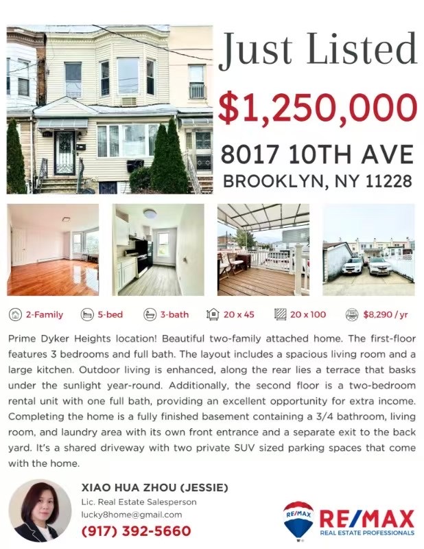 纽约布鲁克林房子出售 Brooklyn NY新上市布碌仑房屋住宅出售布鲁克林豪宅独家出售买卖🔥最新上市🔥 獨家代理布魯克林Dyker Heights 连排2️⃣家庭僅售125萬🏠8017 10th Ave, Brooklyn, NY 11204🎉房子20x45/地20x100/地稅$8300🎉一樓:3房1廳+陽台+雙車位🎉二樓:2房1廳+1廁 🎉完成士库:2房1廳+1廁 預約與咨詢請電 李太☎️(917)392-5660