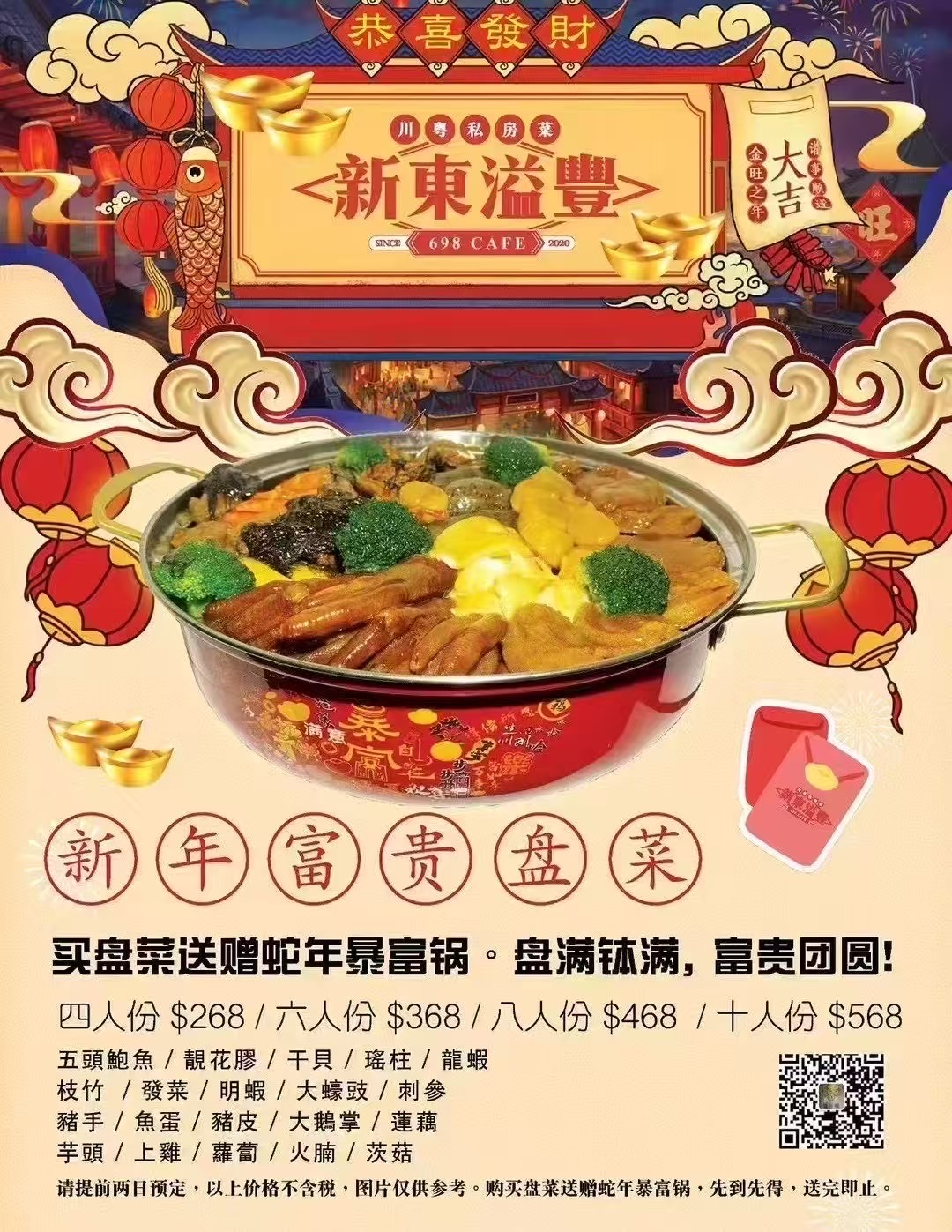 今年,698 CAFE | 新東溢豐 大家准备了象征团圆和丰收的盘菜大餐,让你的新年宴席更加热闹温馨!