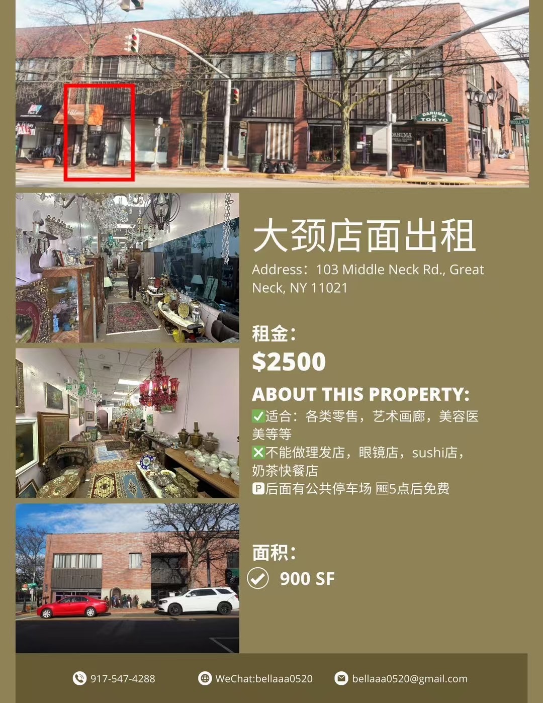 今天4pm到6pm可看(欢迎合作)🏆 🛍️大颈商业街店铺出租商铺size:900SF租金$2500适合:各类零售,艺术画廊,美容医美,等等✅❎不能做理发店,按摩店,眼镜店,sushi店,奶茶快餐店地址:103 Middle Neck Rd.后面有公共停车场🅿️5点后🆓