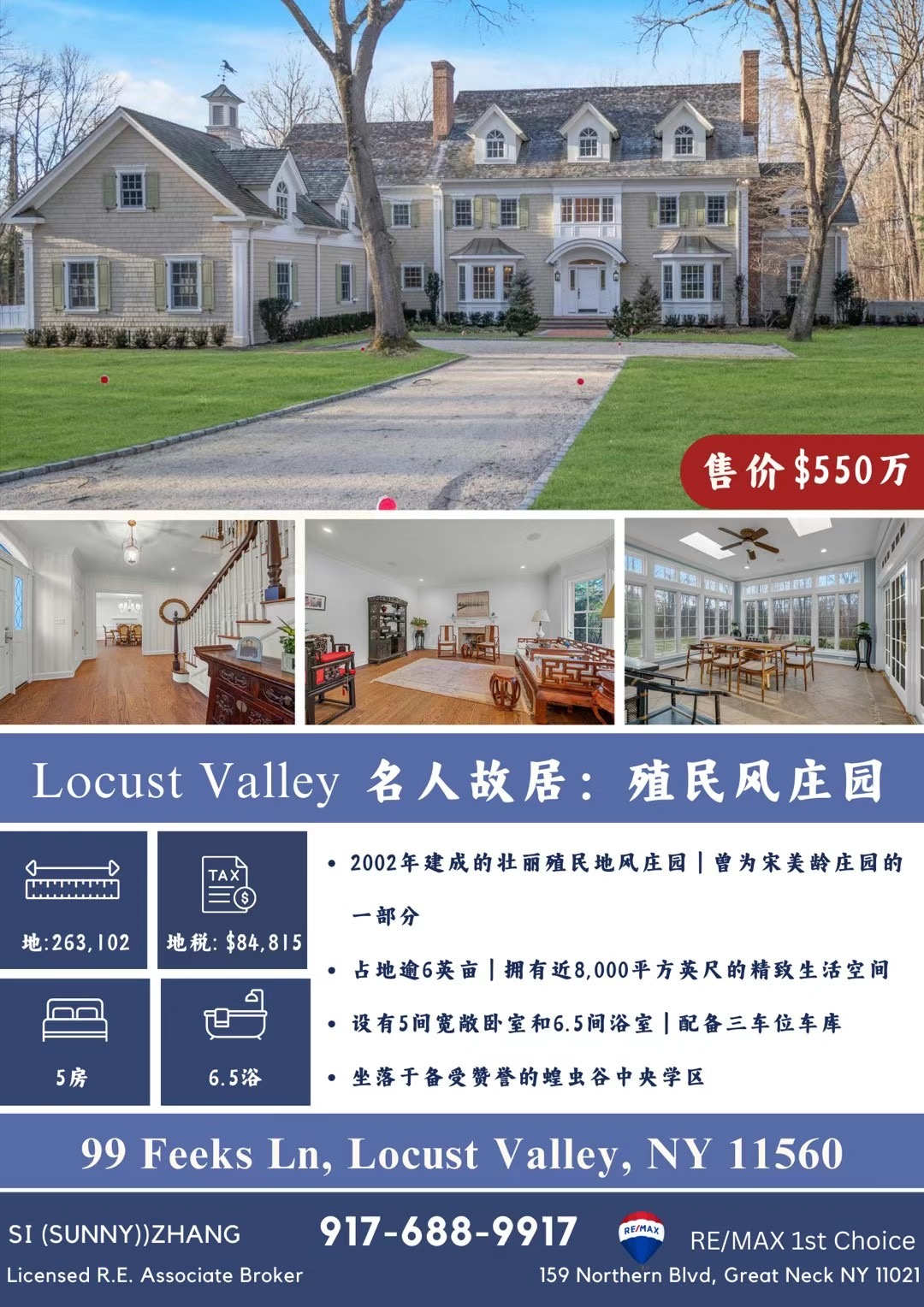 长岛谷溪房子出售Valley Stream NY新上市长岛谷溪房屋独家出售买卖独家代理新上市💰叫价550万 Locust Valley 名人故居:殖民风庄园🏡