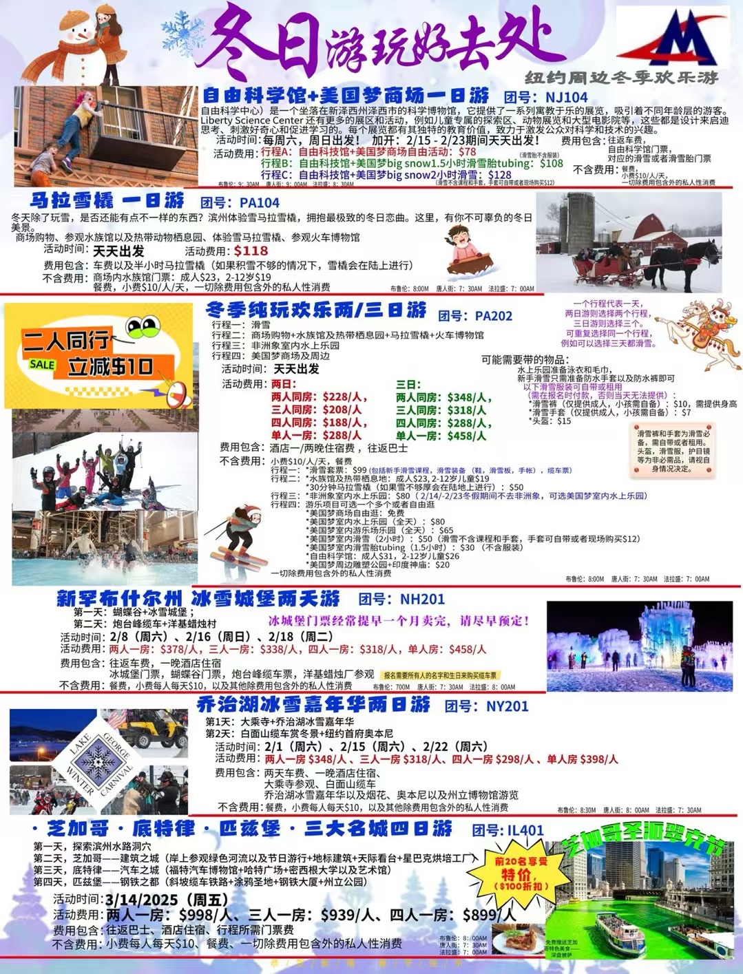 活动时间:每周六,周日出发!加开日期:2/5(周三),2/15-2/23期间天天出发!活动费用:行程A: 梦工厂室内水上乐园以及美国梦购物中心自由活动:$148