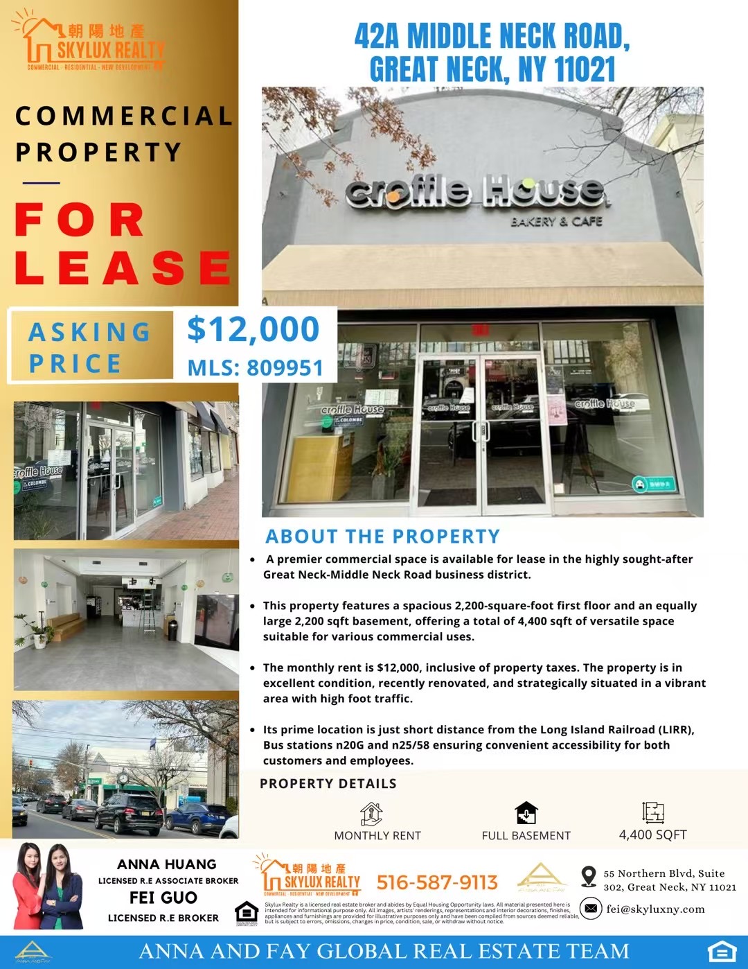新上市 !周一看[太阳][太阳]🥇🥇位于大颈Great Neck-Middle Neck Road商业街的一个黄金店铺出租。 店铺一楼面积为2,200平方英尺,另有同等面积的地下室,总面积达4,400平方英尺,适合各类商业用途。 月租金为$12,000,已包含地税。 店铺状况良好,已装修,地处繁华地段,步行可至长岛铁路LIRR,周边设施齐全。 如有兴趣或需预约看 请联系