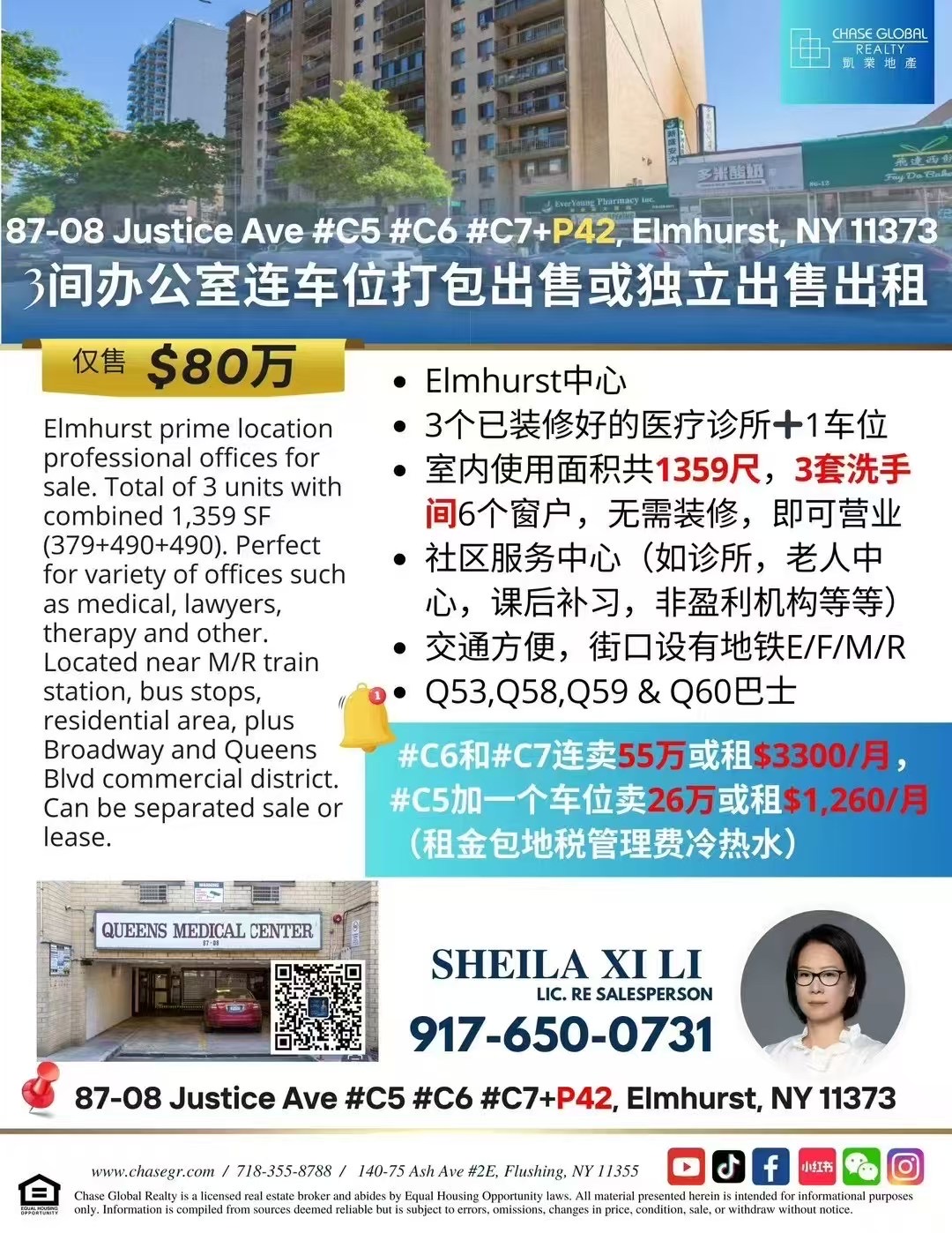 87-08 Justice Ave #C5 #C6 #C7+P42, Elmhurst,NY 113733间办公室连车位打包出售或独立出售出租