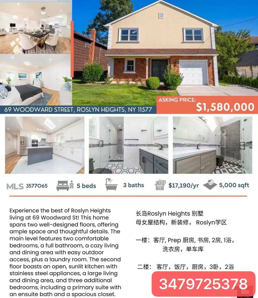 地5,000sf 室内面积2781sf🧧售158万🏠一楼:客厅, Prep 厨房, 书房, 2房, 1浴,洗衣房,单车库二楼: 客厅,饭厅,厨房,3卧,2浴🏫Roslyn SD🏠 69 Woodward Street,