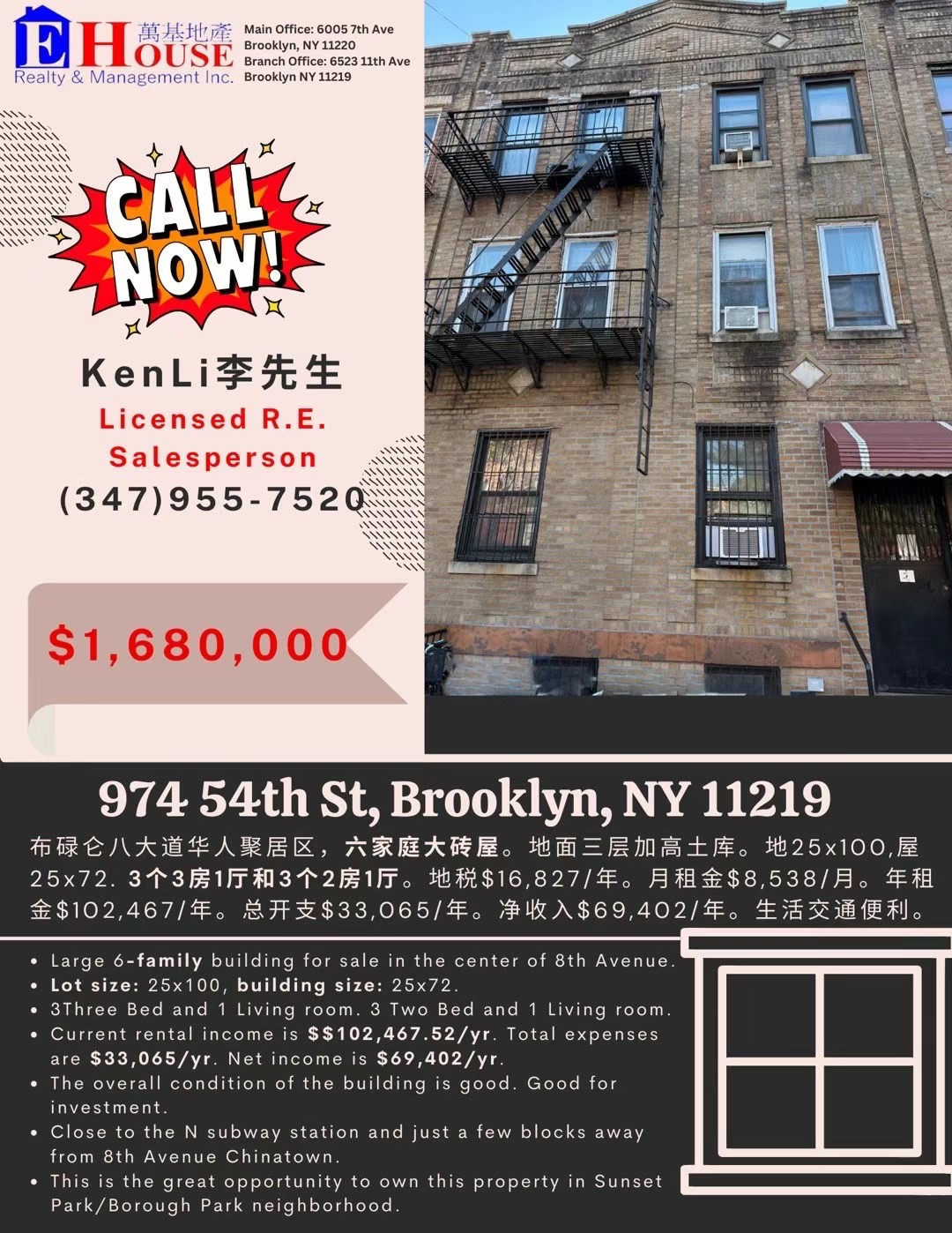 纽约布鲁克林房子出售 Brooklyn NY新上市布碌仑房屋住宅出售布鲁克林豪宅独家出售买卖 9大道54街六家庭出售168万. 请联系我: 3479557520 KenLi