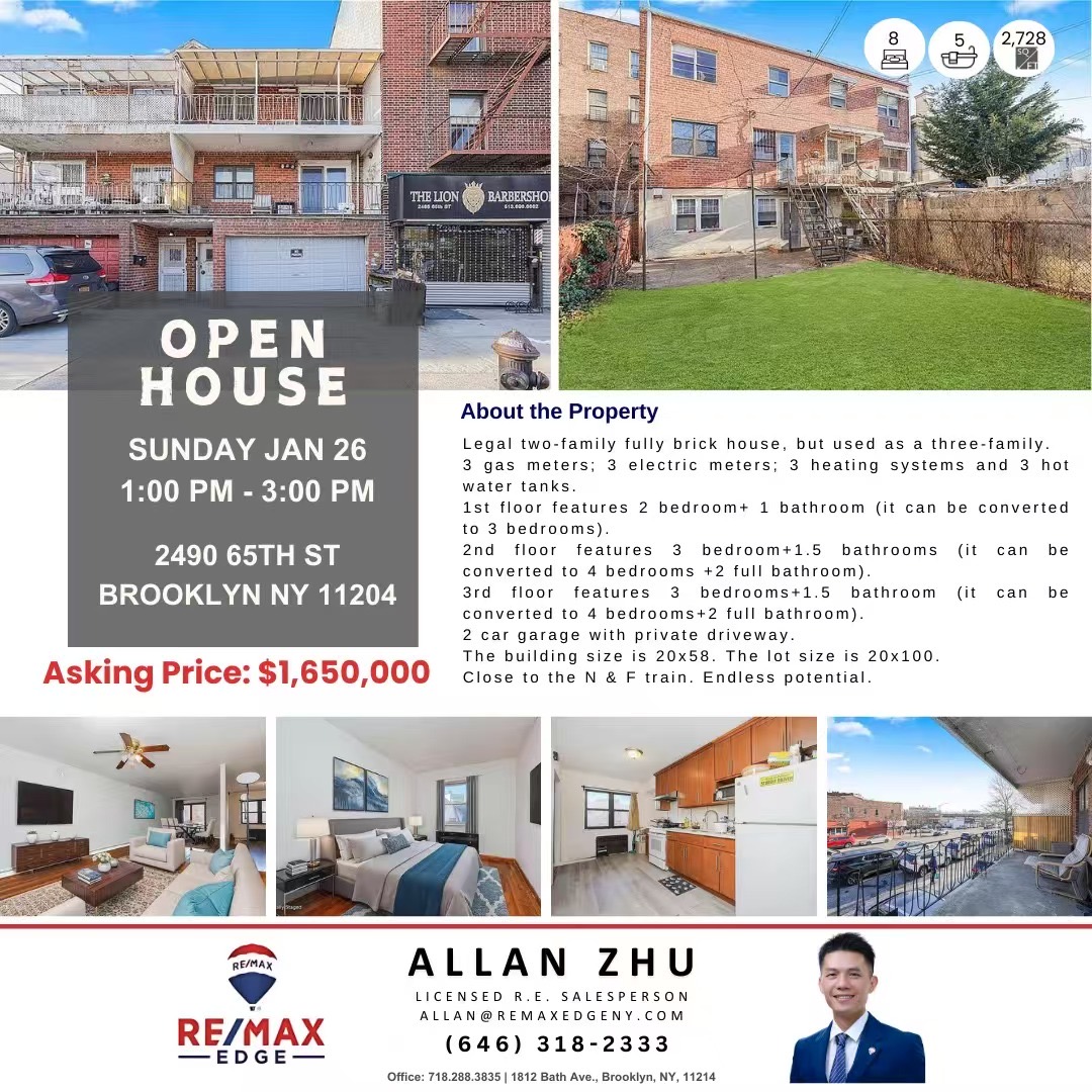 纽约布鲁克林房子出售 Brooklyn NY新上市布碌仑房屋住宅出售布鲁克林豪宅独家出售买卖🎈週日公展🎈週日下午1-3點公開展覽布魯克林全磚地面三層2️⃣家庭用作3️⃣家庭僅售165萬!