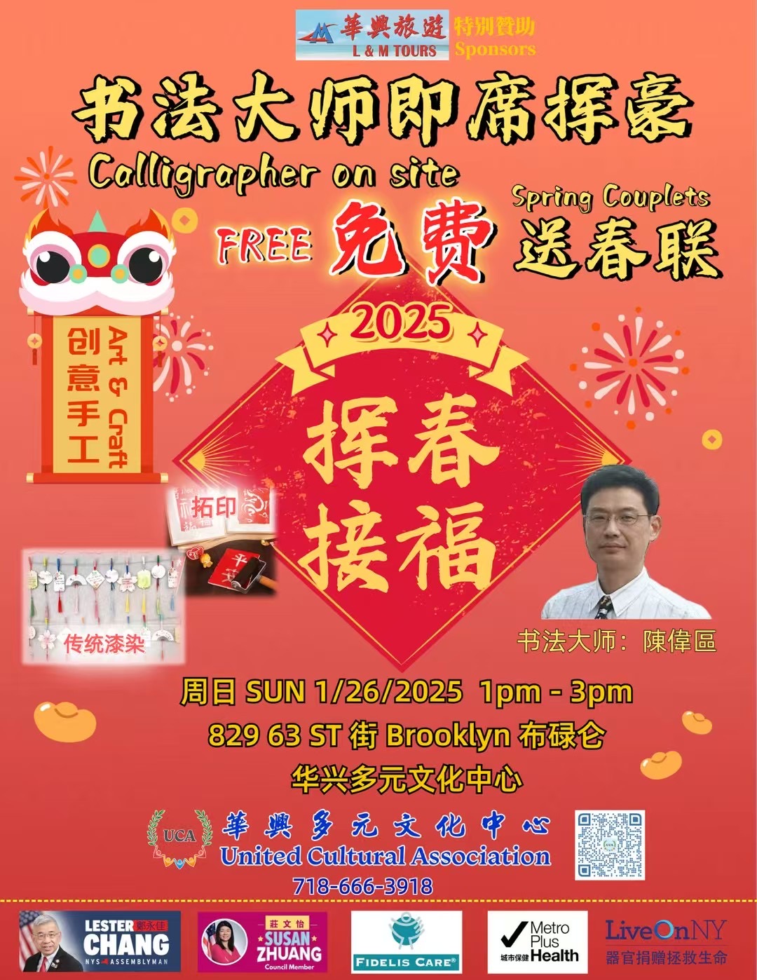 书法大师即席挥豪免費送春联和创意手工周日1/26 1pm - 3pm華興多元文化中心 829 63 St Brooklyn