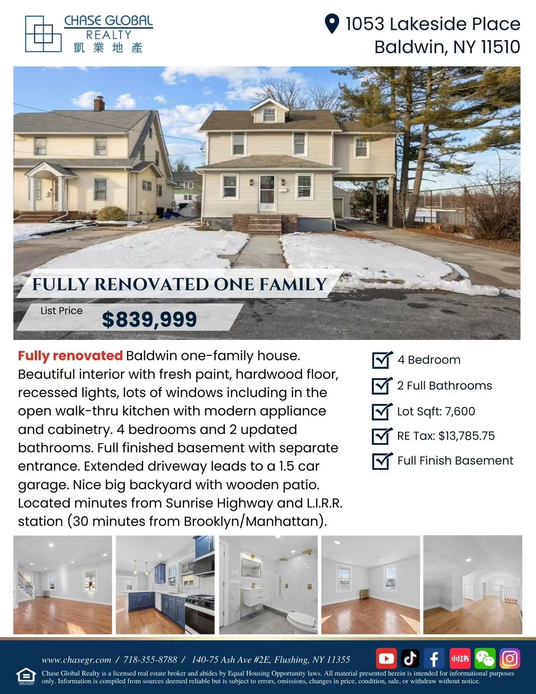🔹距 Sunrise 高速公路和 L.I.R.R.车站 仅几分钟路程,距离布鲁克林/曼哈顿 30 分钟。