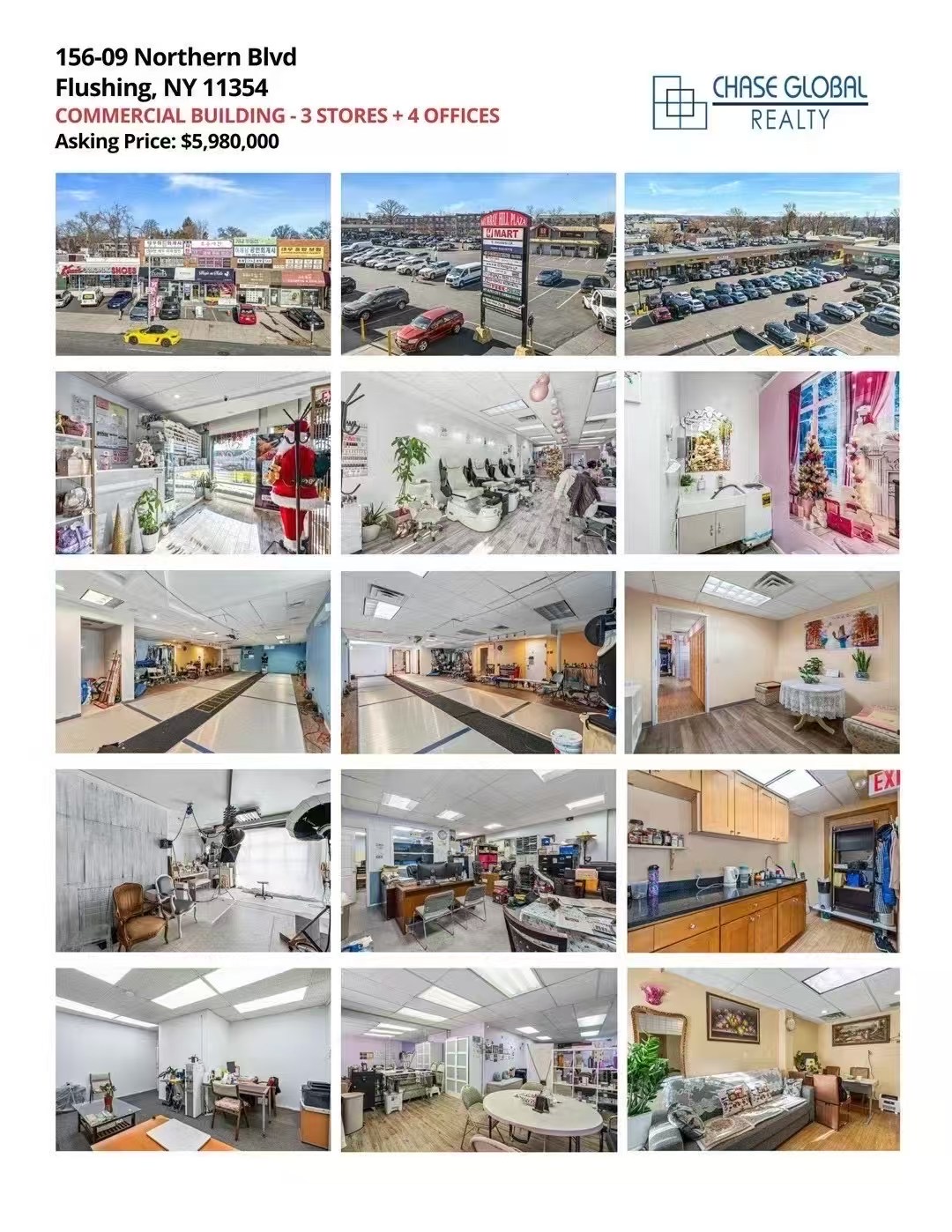 Location, Location, Location! Incredible investment opportunity located in North Flushing, primary business district on Northern Blvd. Across from Murray Hill Plaza shopping center with H Mart. This prime commercial property boasts 8,325 SF of rentable space featuring 3 stores plus 4 commercial offices and parking space. Fully tenants occupied. Close to Broadway LIRR train station. Only a few minutes from Downtown Flushing.