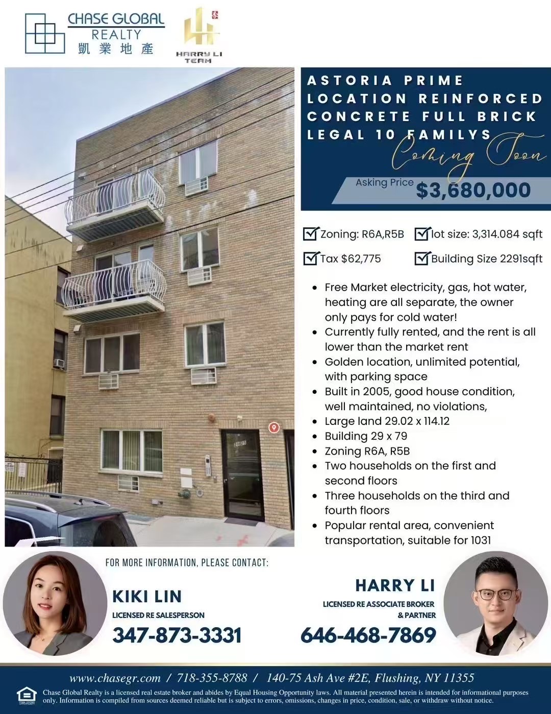 纽约皇后区房子出售买卖网Queens NY Residential新上市皇后区房屋住宅出售网 独家代理!抢先看!欧洲建商!Astoria黄金地段钢筋水泥全砖合法🔟家庭🔥$368万💰Free Market💎电、Gas、热水、暖气全部分开,屋主只付冷水❗️目前满租,且租金全部低于市场租金,黄金地段,潜力无限,带车位,2005年建造,屋况好,保养佳,无违规,地大29.02 x 114.12,Building 29 x 79,Zoning R6A,R5B,旺租地段,交通便利,适合1031👍欢迎同行精英们转发与合作🤝(专业照片与视频在整理中📹请凭资金证明私信获取详情⚠️)