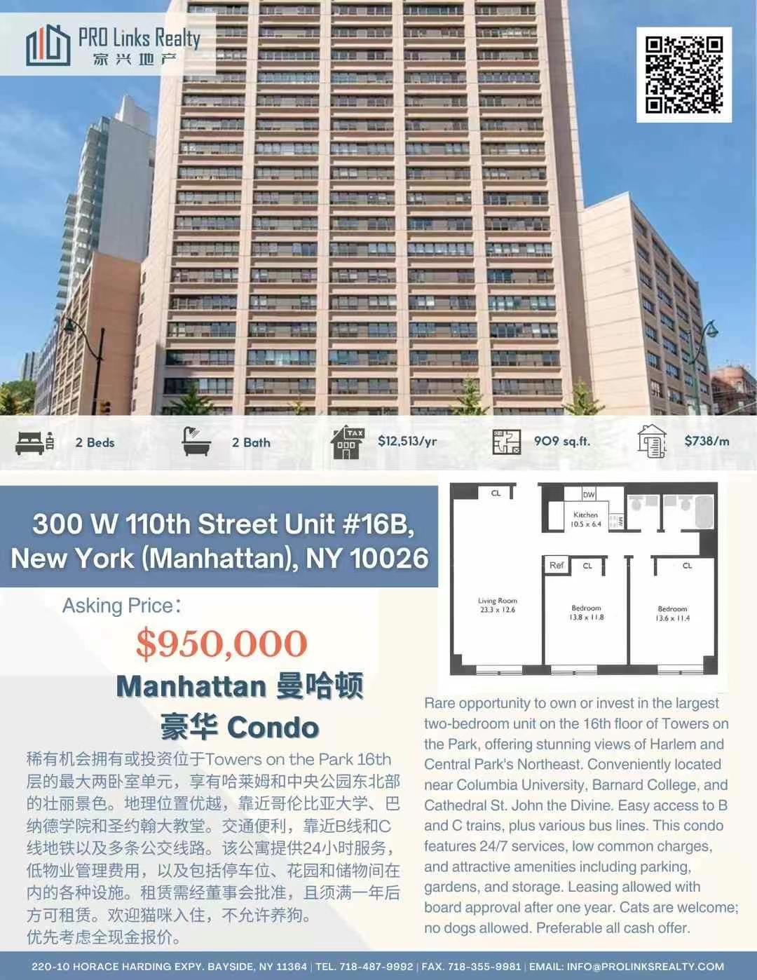 享有哈莱姆和中央公园东北部的壮丽景色。位置便利,靠近哥伦比亚大学, 该公寓设有24/7门卫,低管理费,停车场、空中花园和储物间